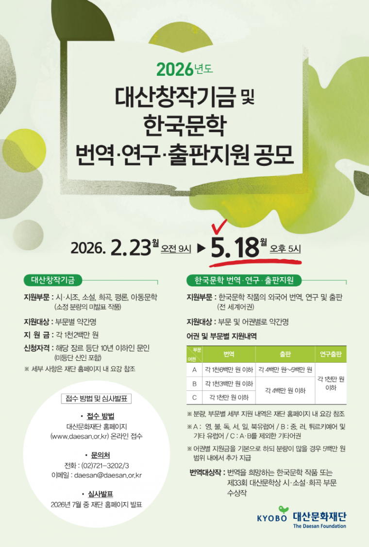 2) 지원대상자는 출판된 작품의 판권란에 반드시 ‘2026년 대산문화재단 대산창작기금 수혜작’