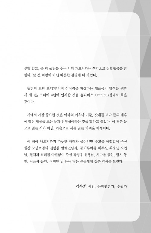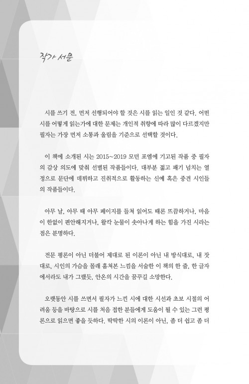 오랫동안 시를 쓰면서 필자가 느낀 시에 대한 시선과 초보 시절의 어려움 등을 바탕으로 시를 처음 접한 분들에게 도움이 될 수 있는 그런 평론으로 읽으면 좋을 듯하다. 딱딱한 시의 이론이 아닌, 좀 더 쉽고 좀 더 부담 없고, 좀 더 울림을 주는 시의 개요서라는 생각으로 집필했음을 밝힌다. 날 선 비평이 아닌 따뜻한 감평에 더 가깝다.