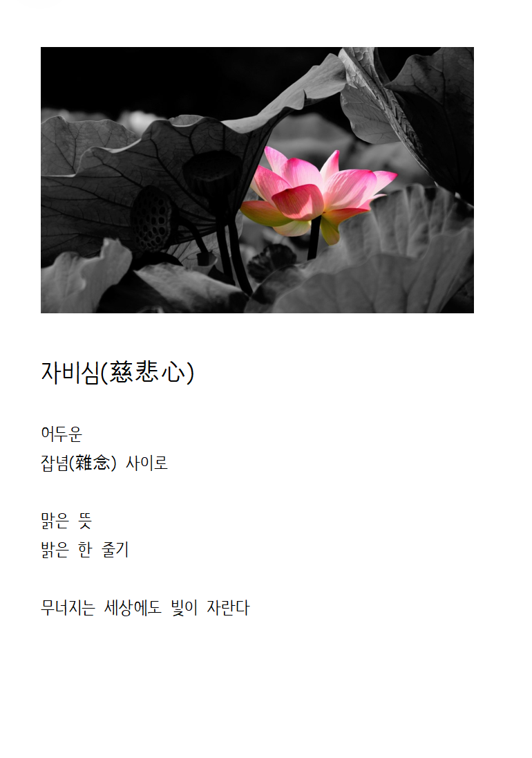 자비심(慈悲心) 페이지 정보 작성자 晩霞 쪽지보내기 메일보내기 자기소개 아이디로 검색 전체게시물 쪽지보내기 메일보내기 자기소개 아이디로 검색 전체게시물 댓글 2건 조회 351회 작성일 24-09-08 10:06 본문 목록 댓글목록 댓글목록 시인삼촌님의 댓글 시인삼촌 쪽지보내기 메일보내기 홈페이지 자기소개 아이디로 검색 전체게시물 쪽지보내기 메일보내기 홈페이지 자기소개 아이디로 검색 전체게시물 작성일 24-09-11 08:04 넘 좋네요 넘 좋네요 晩霞님의 댓글의 댓글 晩霞 쪽지보내기 메일보내기 자기소개 아이디로 검색 전체게시물 쪽지보내기 메일보내기 자기소개 아이디로 검색 전체게시물 작성일 24-09-12 10:20 공감해 주셔서 감사드립니다.^^ 공감해 주셔서 감사드립니다.^^