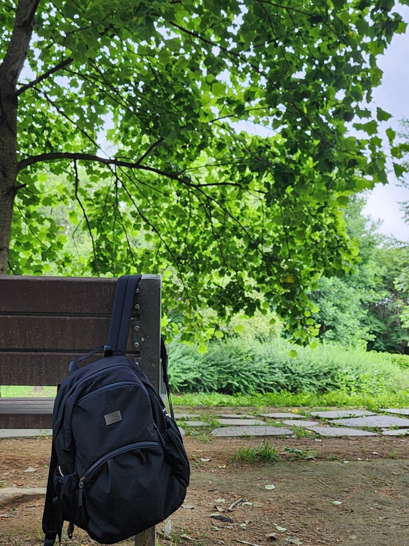 나무그늘의 푸름과 밴치 그리고 검은색 배낭이