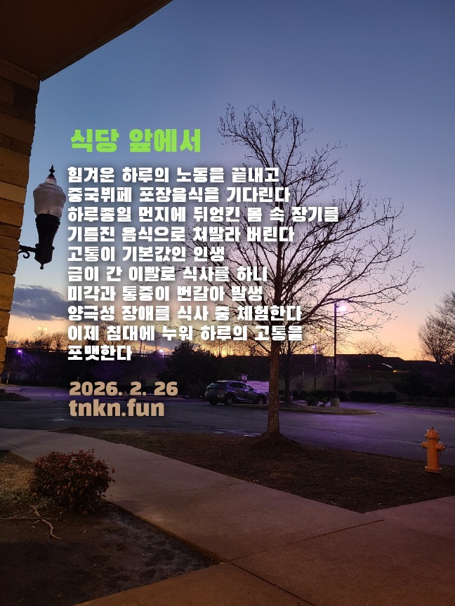 식당 앞에서 페이지 정보 작성자 짭짤한시인 쪽지보내기 메일보내기 홈페이지 자기소개 아이디로 검색 전체게시물 쪽지보내기 메일보내기 홈페이지 자기소개 아이디로 검색 전체게시물 댓글 0건 조회 124회 작성일 26-02-27 12:08 본문 Tennessee Korean Network 짭짤한시인의 책방 아마존 서재 목록 댓글목록 댓글목록 등록된 댓글이 없습니다.