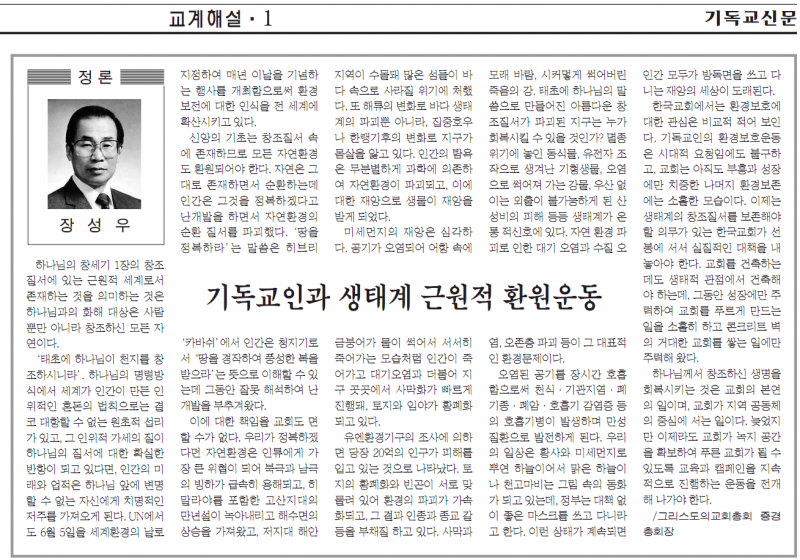 늦었지만 이제라도 교회가 녹지 공간을 확보하여 푸른 교회가 될 수 있도록 교육과 캠페인을 지속적으로 진행하는 운동을 전개해 나가야 한다. /그리스도의교회총회 증경총회장 |