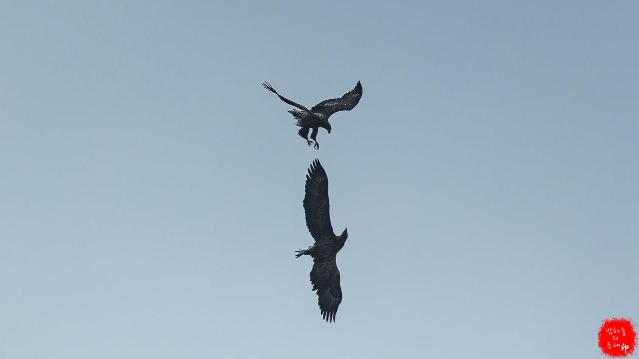 아래의 사진 두 장이 참수리와 흰 꼬리수리의 공중전입니다.