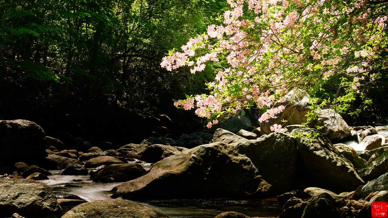 수달래와 계곡물을 따로 찍어 합성해도 될만한 환경인데