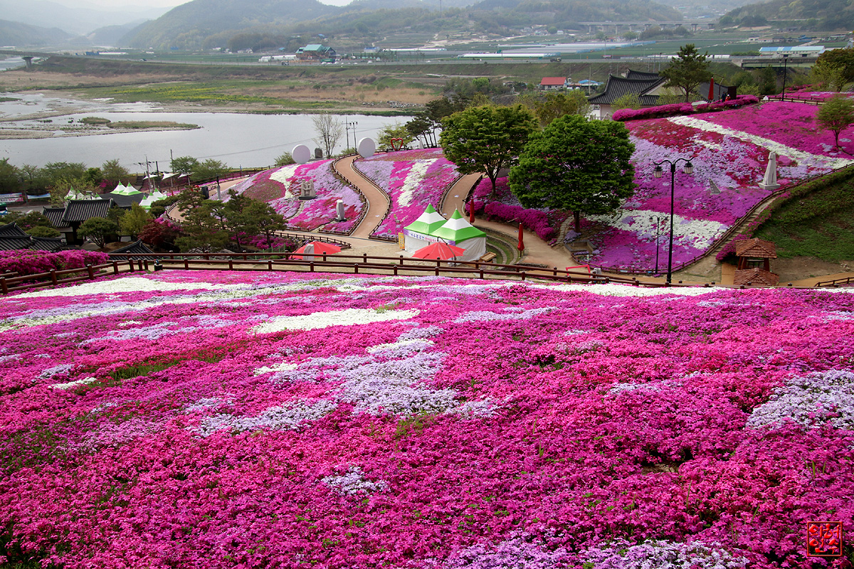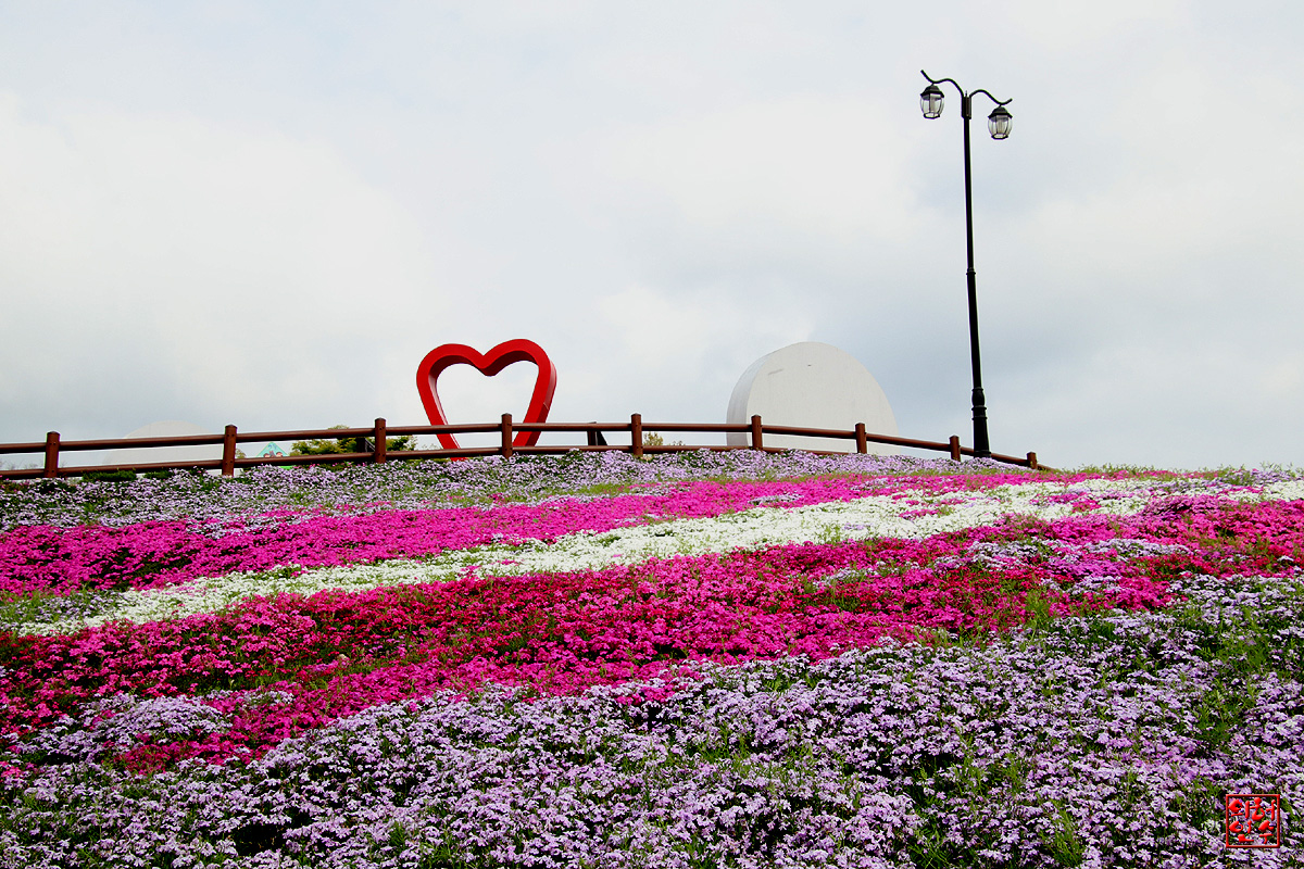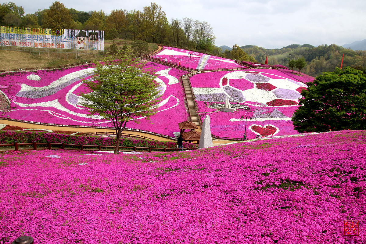 꽃잔디 동산의 잘 꾸며진 아름다운 모습을 봅니다.