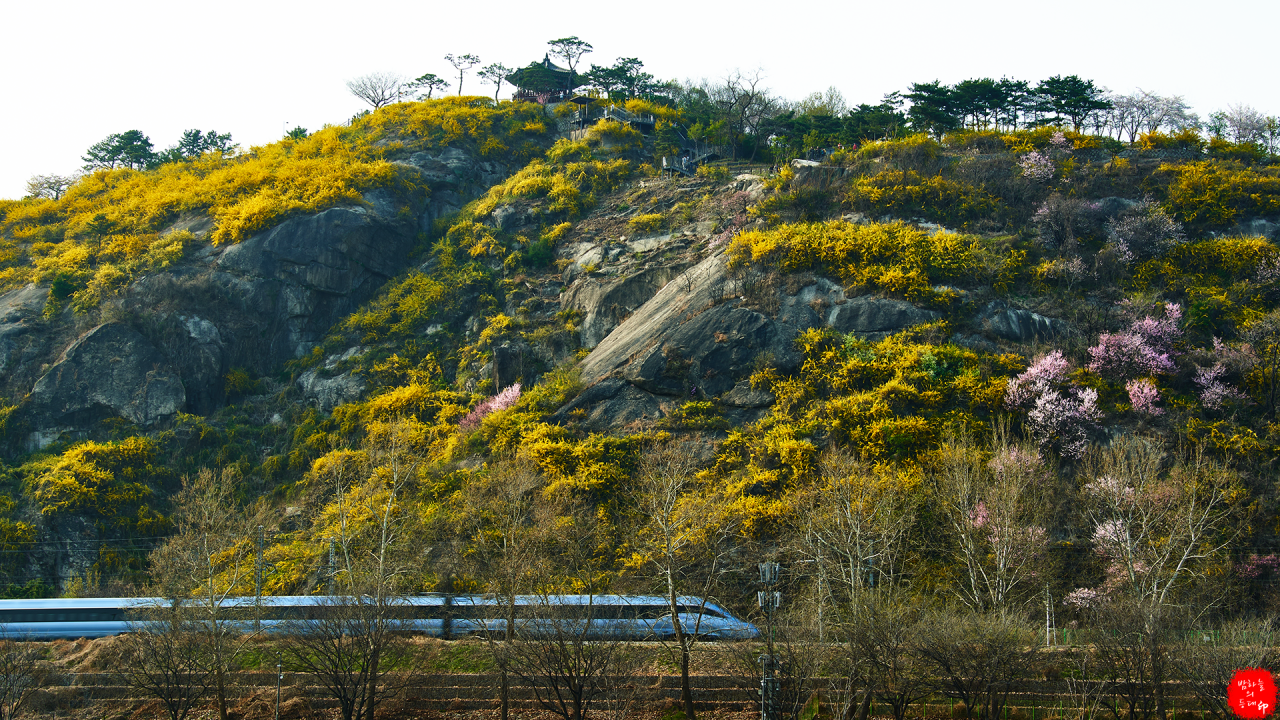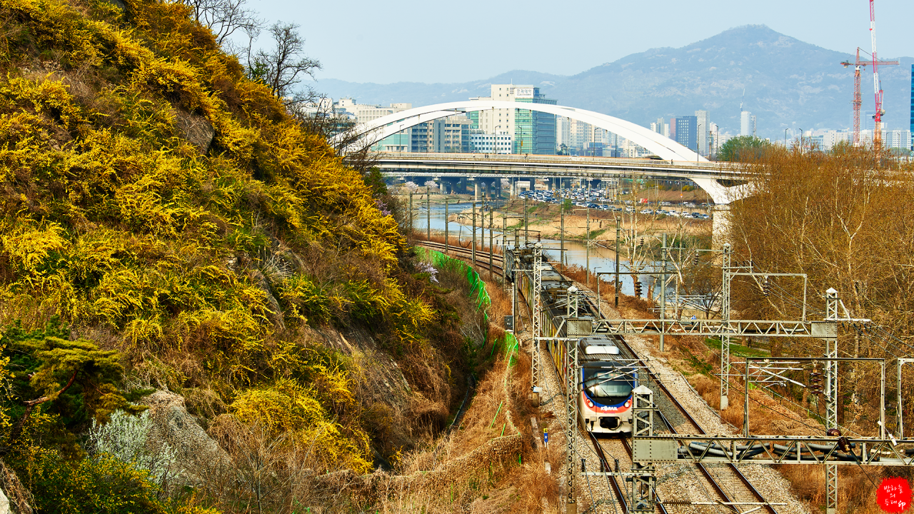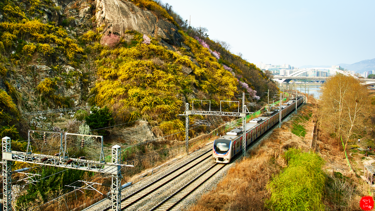 황금빛으로 물든 응봉산 그아래로 봄을 싣고온 열차가 지나가고