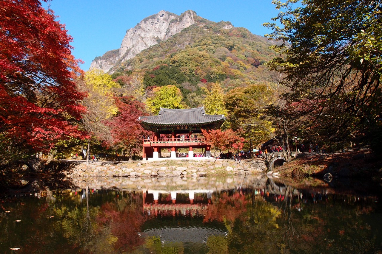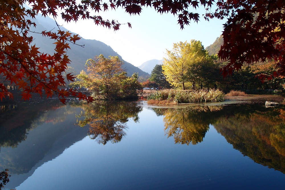 단풍과 나무 두그루(는 아니지만..)의 푸른 물속 반영의 풍경이 넘 아름다운..