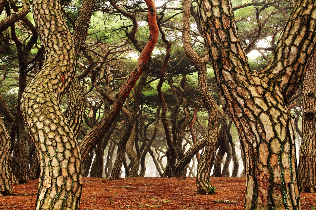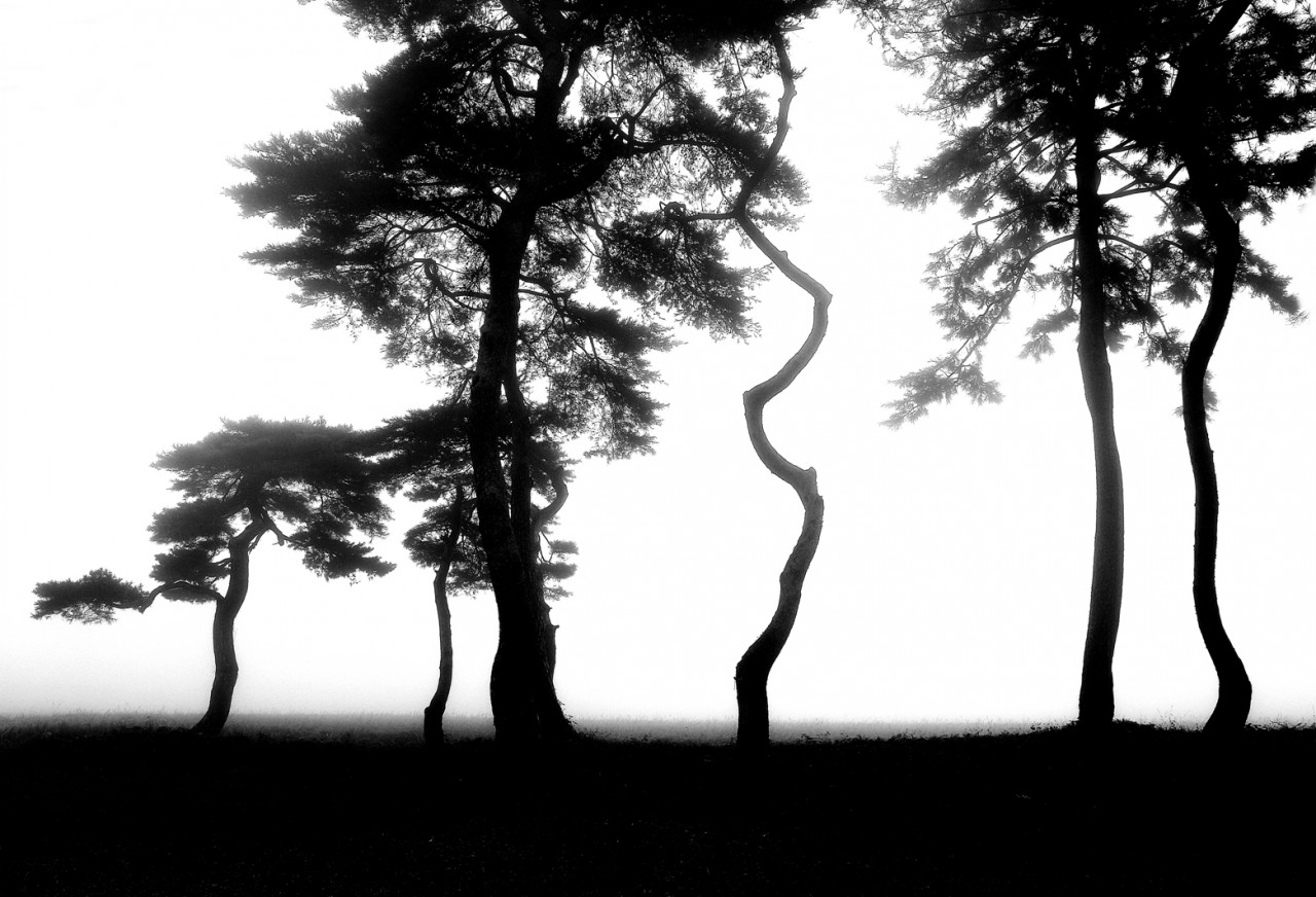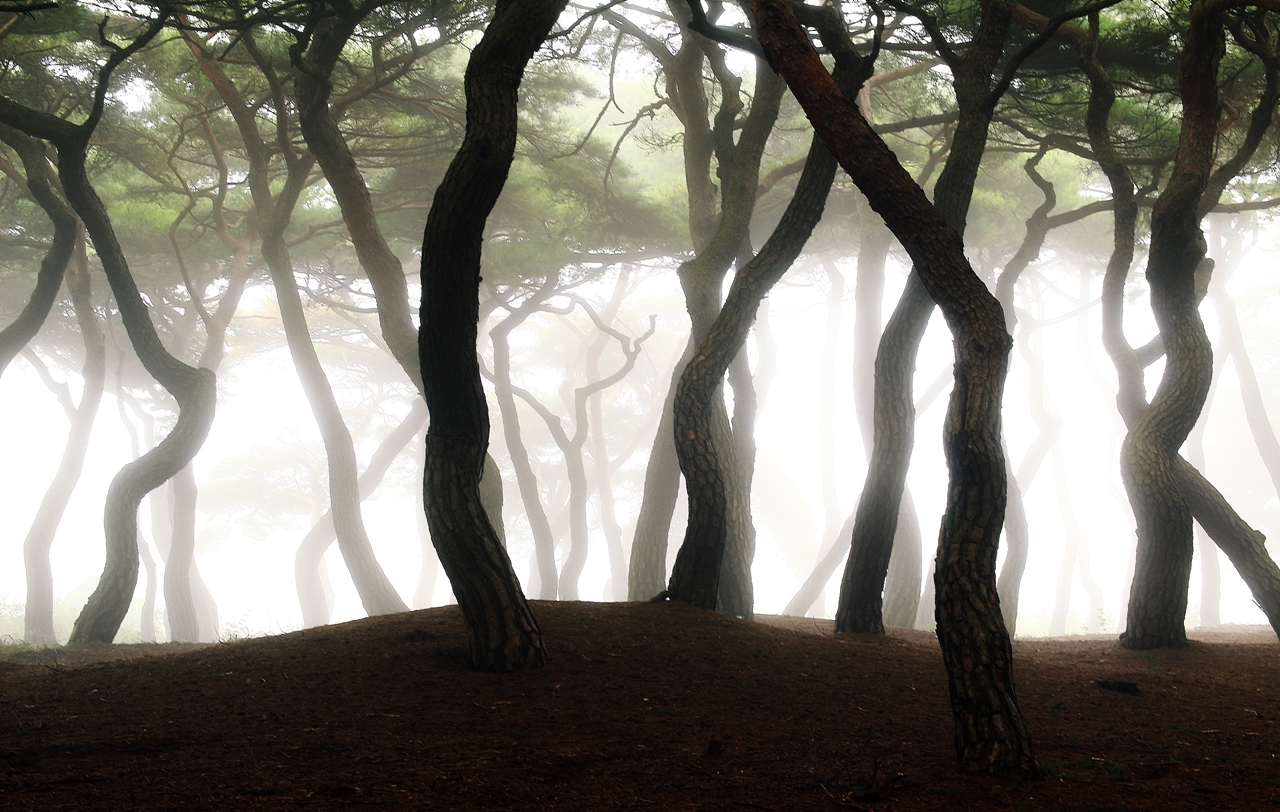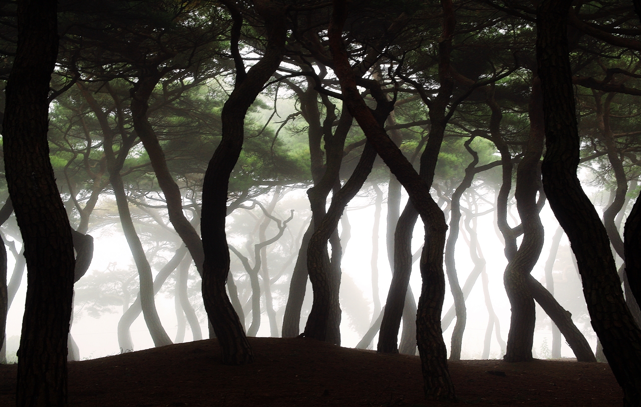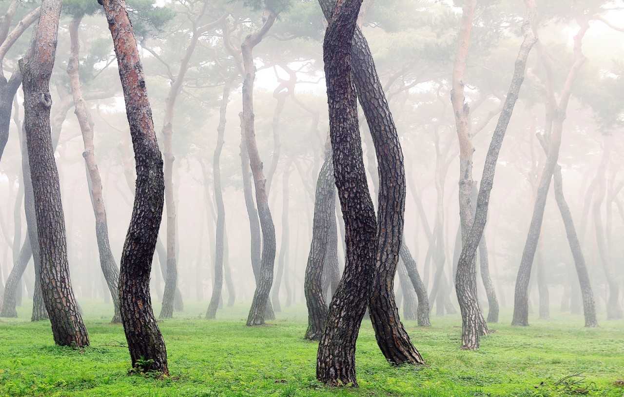 소나무 특유의 아름다운 색과 자태 분위기, 안개까지