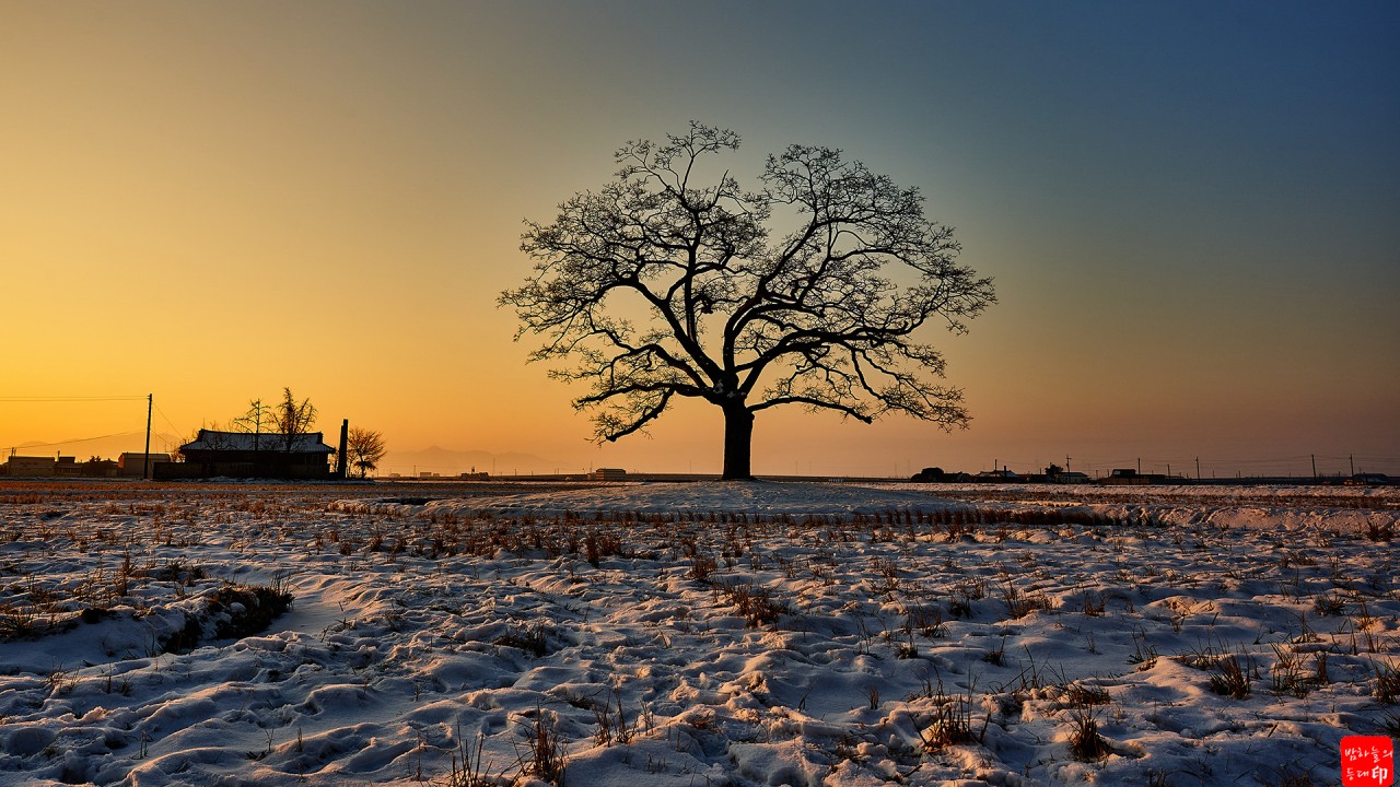 나무라 하죠.나홀로 나무는 역사가 그리 길지는 않은 것처럼 보이네요. 그러나 눈 덮힌 들녘에 붉은 노을. 그리