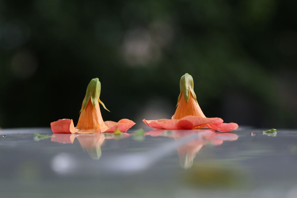비 온후 자동차 지붕위에 낙화된 능소화와 잠깐 놀았습니다.