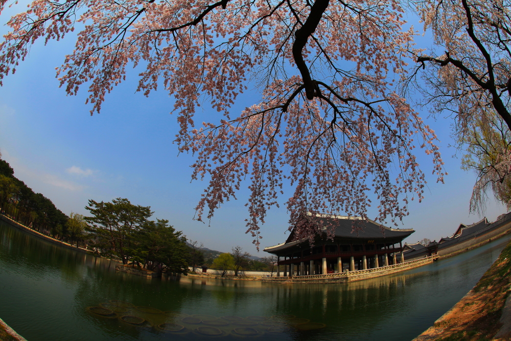 경회루와 능수벚꽃의 조화로움이 환상적인 풍경입니다.