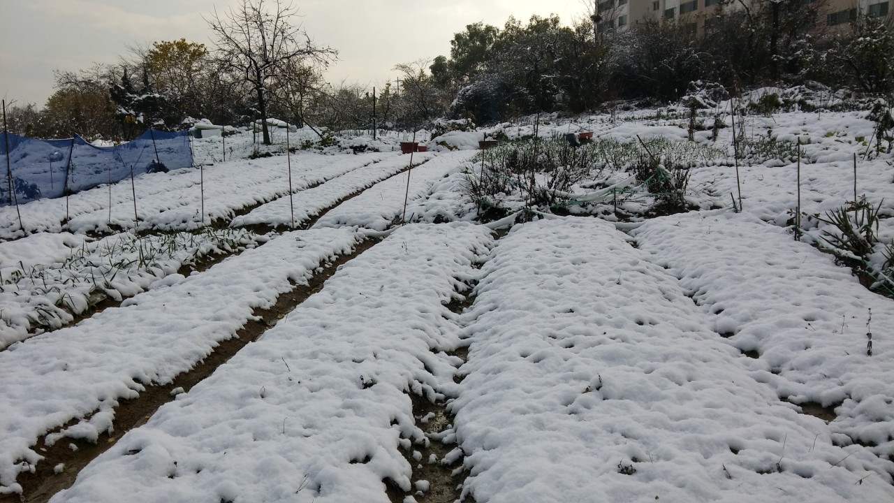 텃밭에 쌓인 하얀 눈이 인상적입니다.