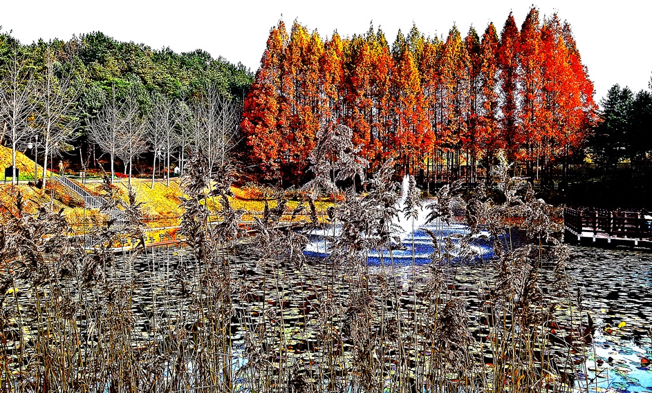 와...멋집니다..메타세콰이어에물든 늦가을붉은홍조랑 노랑잔디 은빛갈대숲,,아늑한 연못이야기들.... 고맙습니다