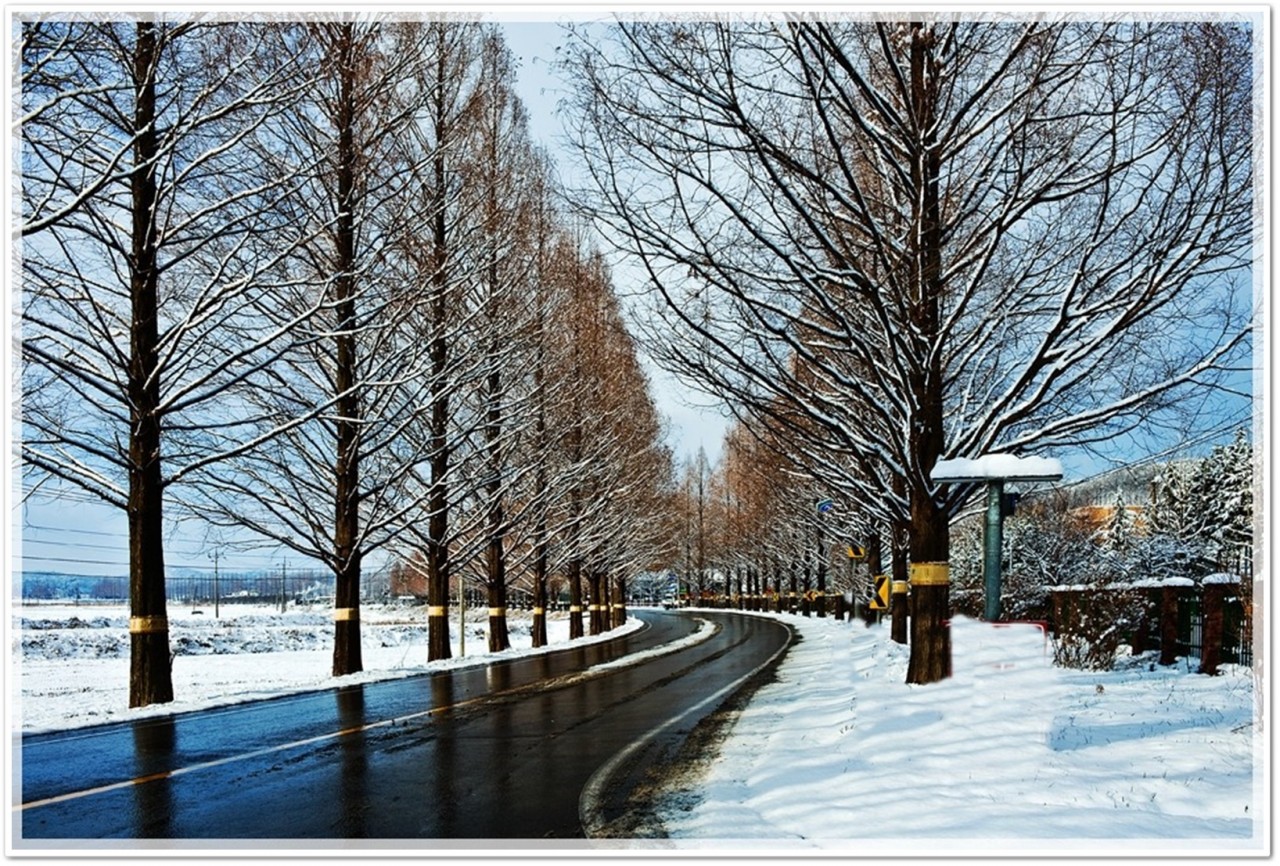 쭉 뻗은 메타쉐콰이어 나무들에 흰눈이 내려앉은 모습들 멋지네요!