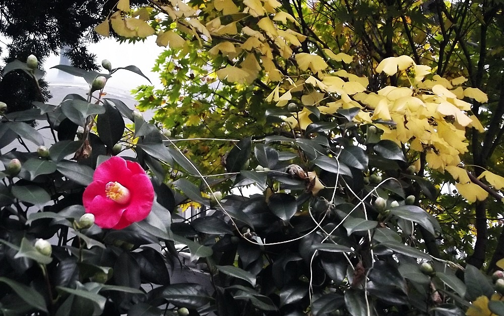 노란 잎새들 아래 붉은 동백꽃 한송이에도 가슴이 뛴다.