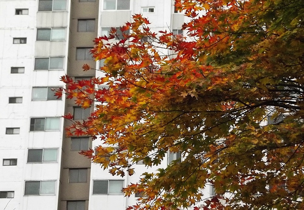 아파트앞 여전히 고운 단풍나무 한그루에 시선 멈추고