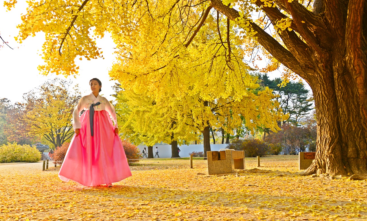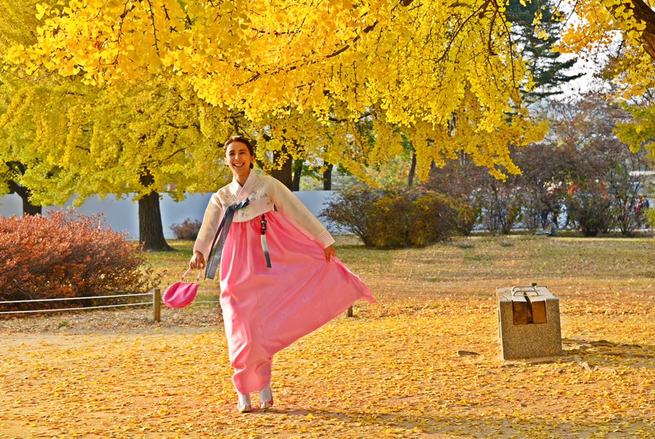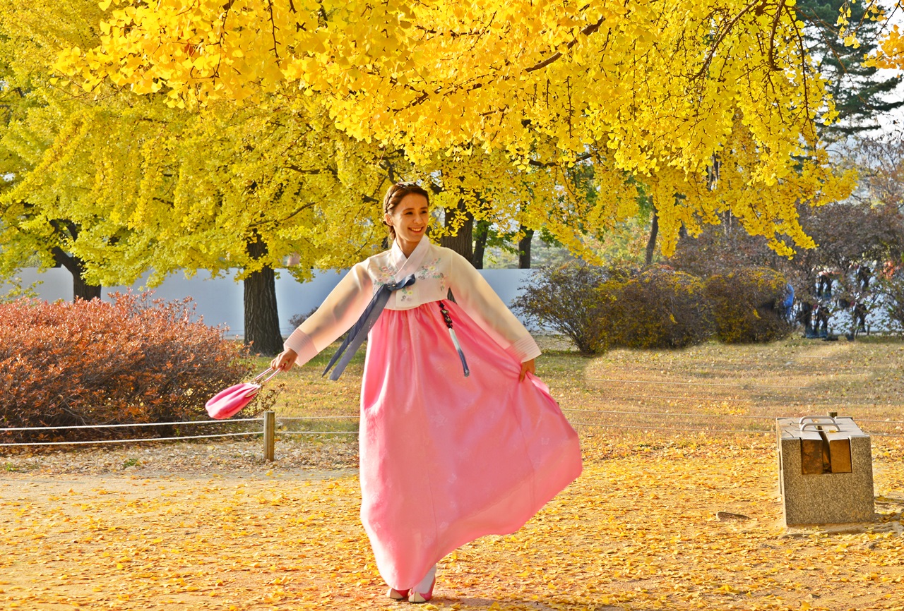 노랑 가을속 한복 입은 어여쁜 자태가 날아갈듯..