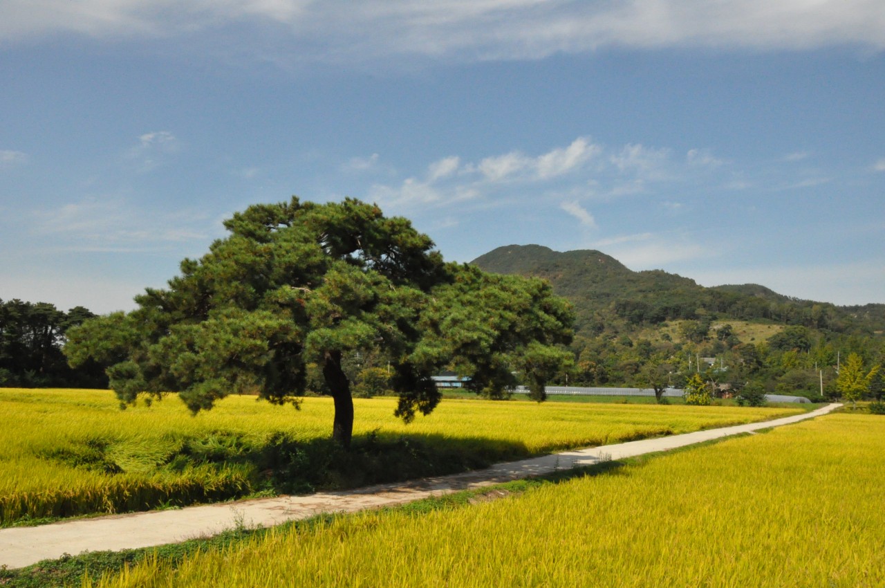 맑고 푸른 하늘과 황금들판과 독야청청 소나무 한그루와의 어울림이 참으로 근사합니다.