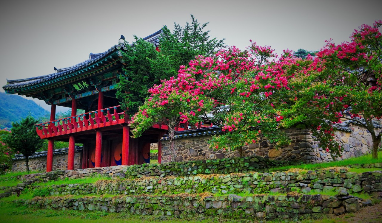 화사하게 피어난 배롱나무 꽃잎들과 누각의 모습이 참 잘 어울립니다.