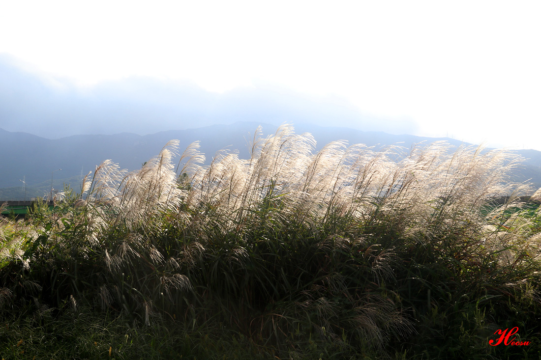 햇빛에 반사되는 은빛 억새풀이 바람에 흔들리는 모습을