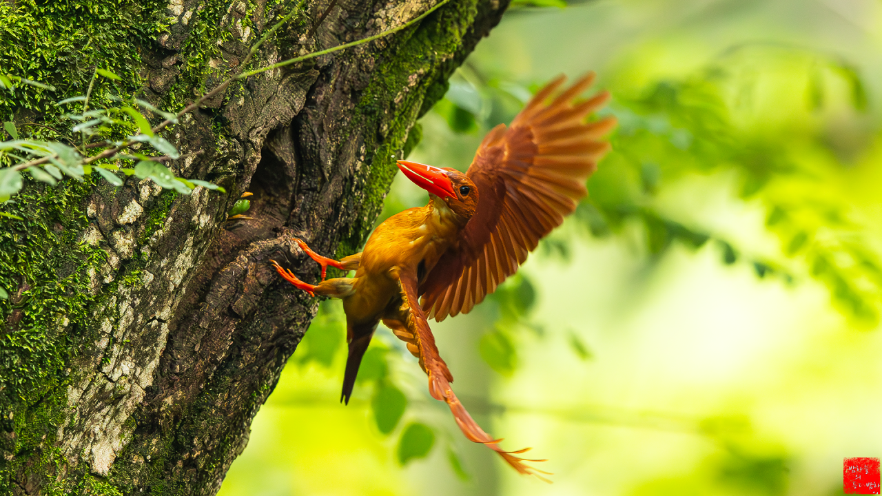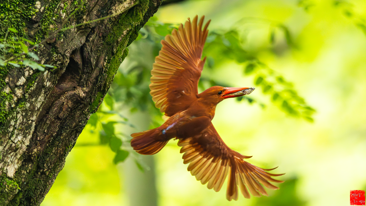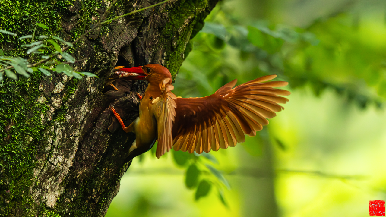 절개지에 둥지를 파서 육추를 하는 청호반새와 달리, 딱따구리가 파놓은 나무 둥지에서
