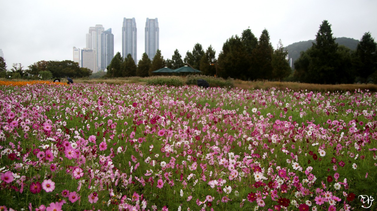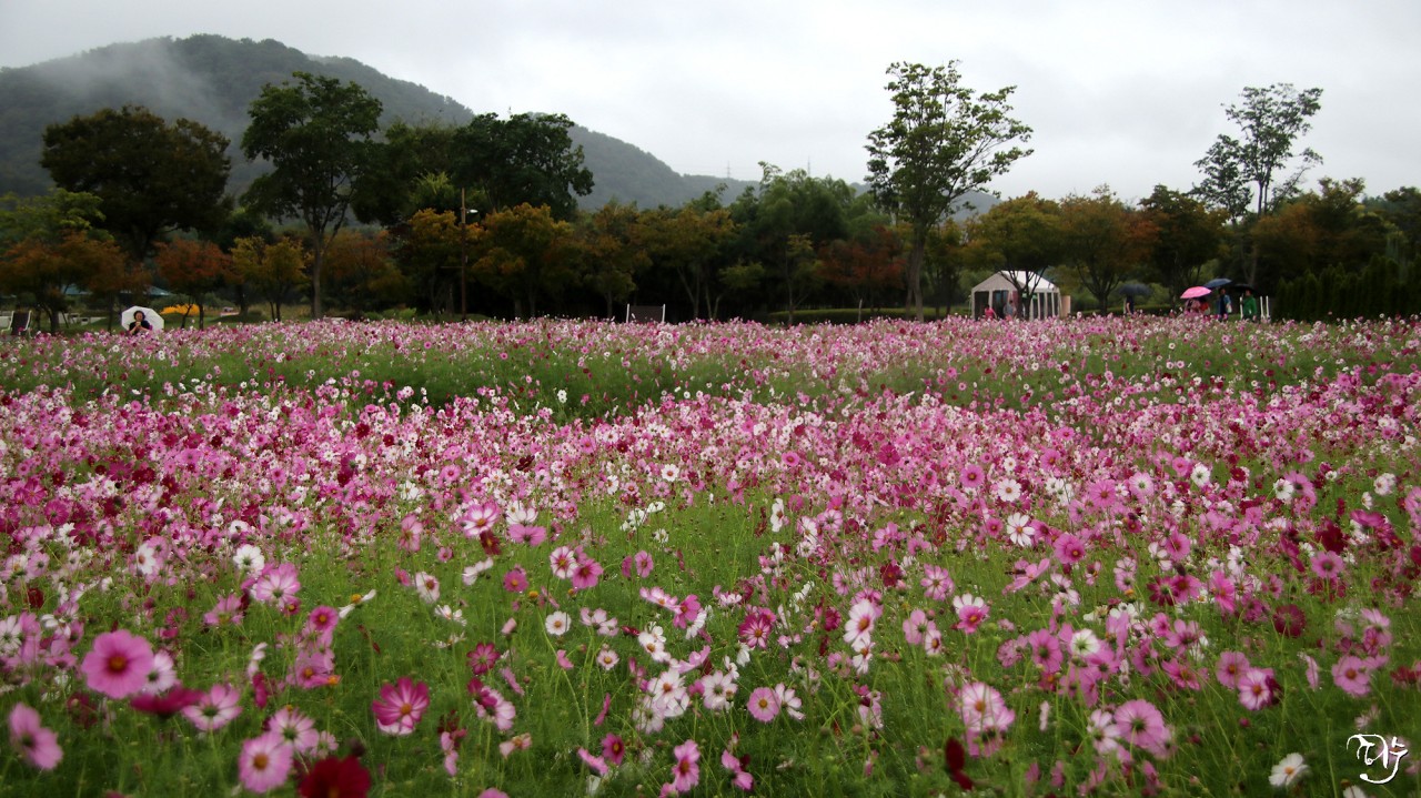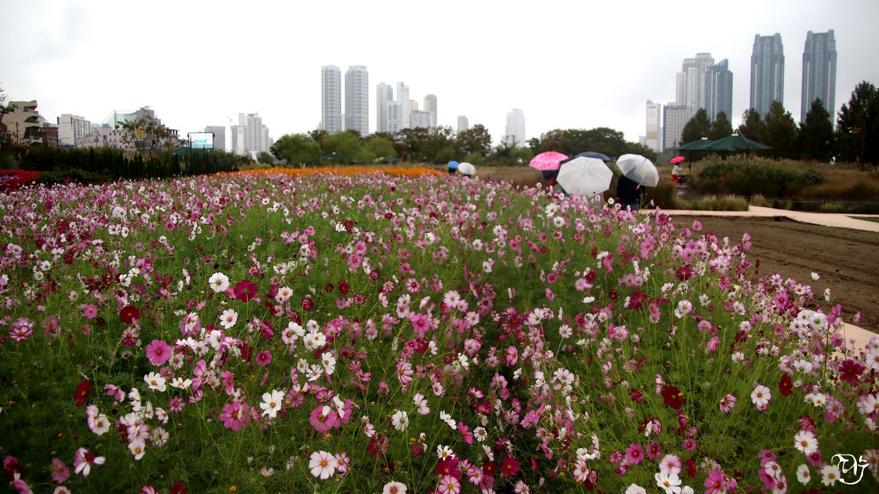 비가 오는데 우산을 쓰고 코스모스 정원을 다니시는 분들이