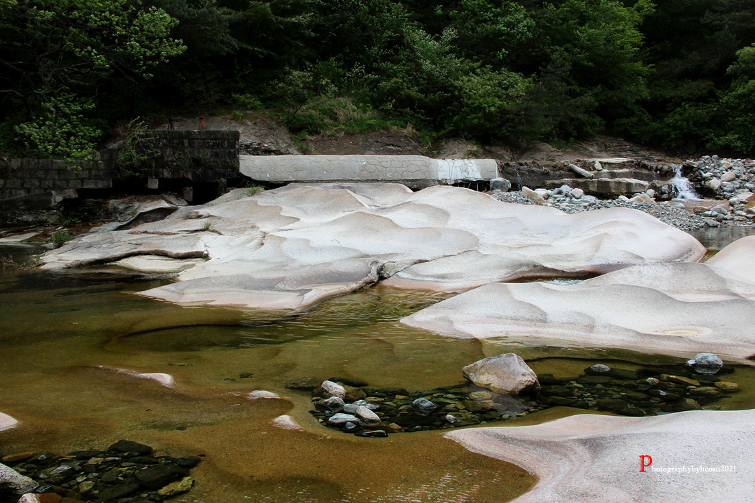 저 웅장함 큰 바윗돌 아래 해맑은 물 아주 청정 지역의 바윗돌인가봐요