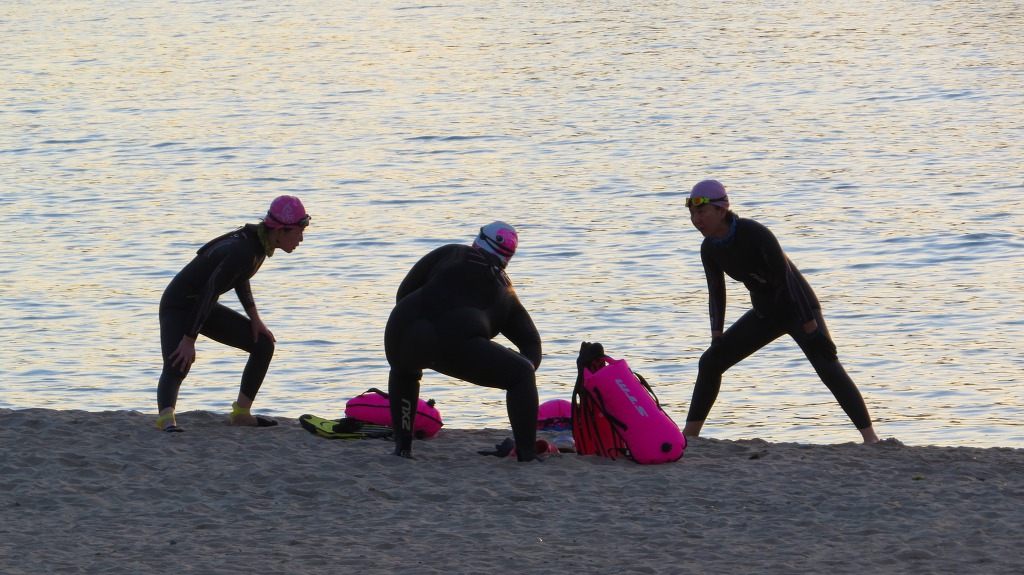 모래사장에서 해녀들이 운동하는모습.
