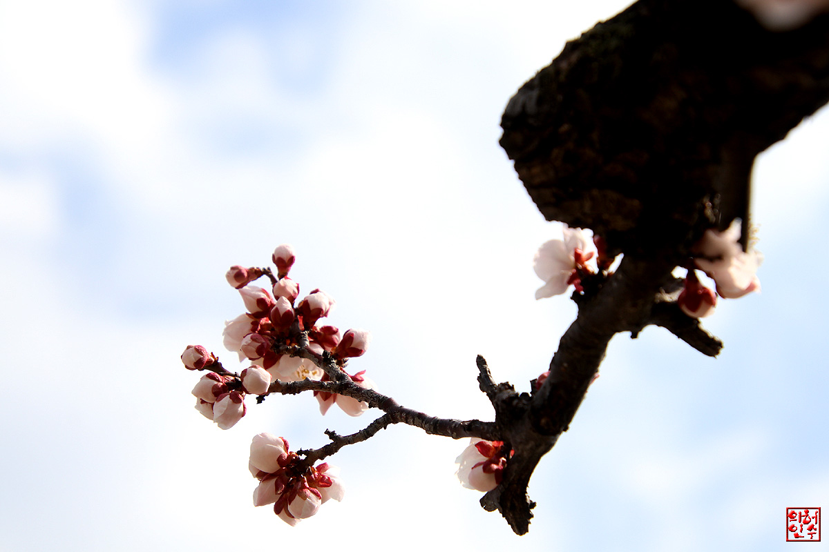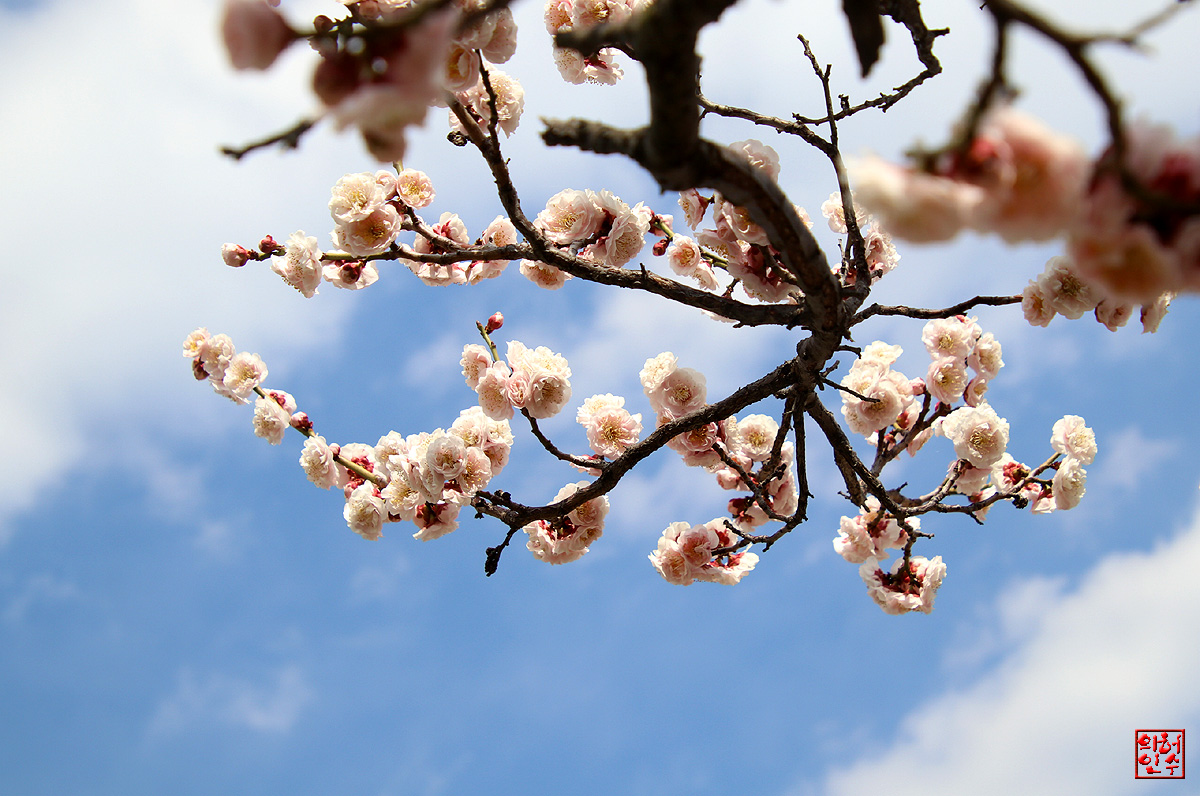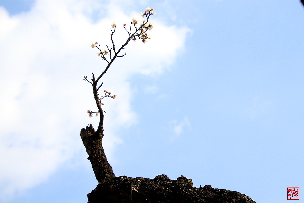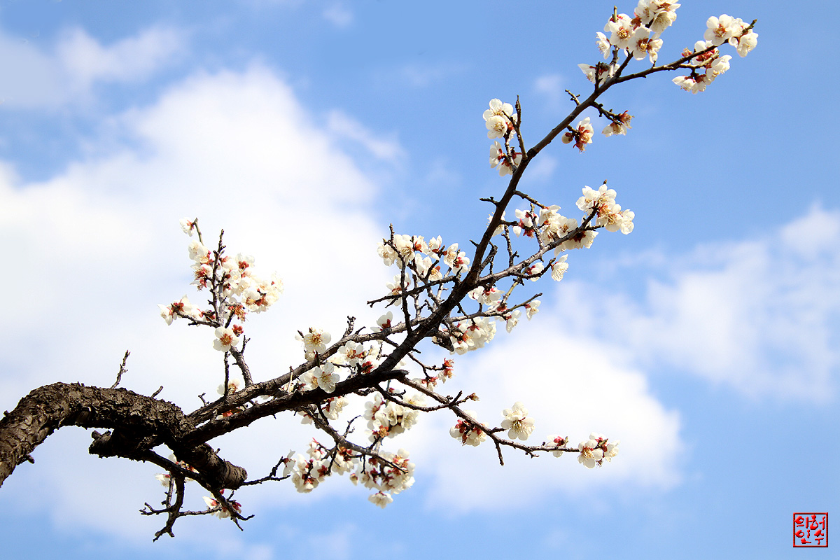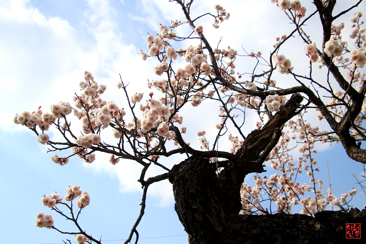 "푸른하늘"과 "하얀구름"사이,古木에핀 "梅花"가 아름답구여..