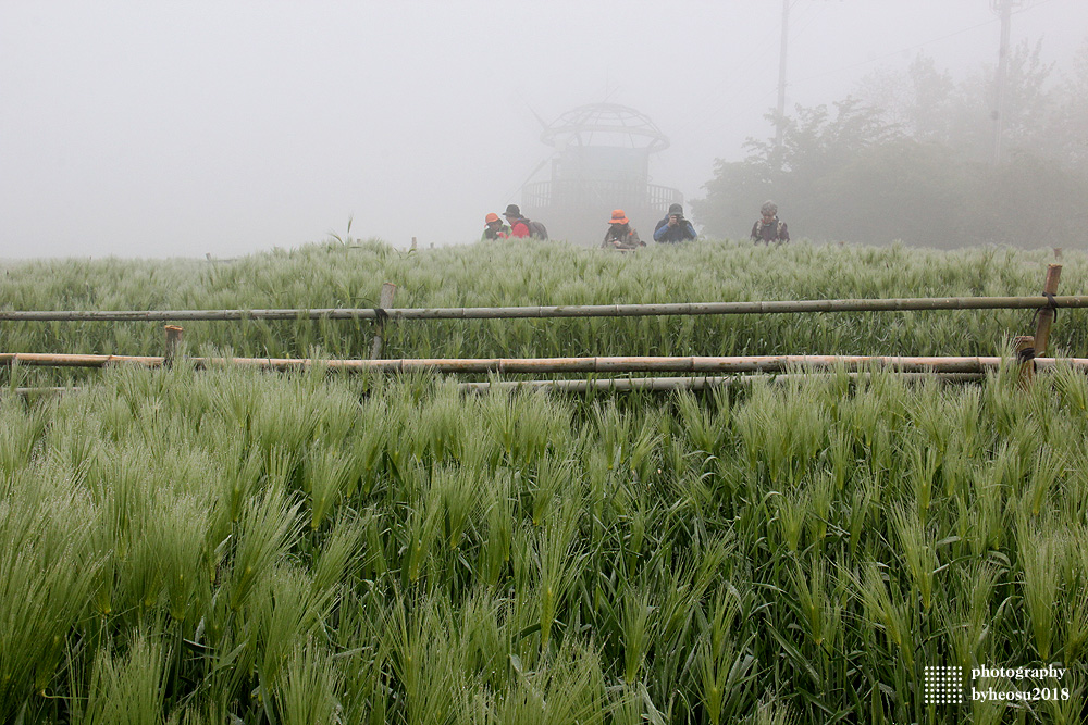 자욱한 안개속의 청보리밭