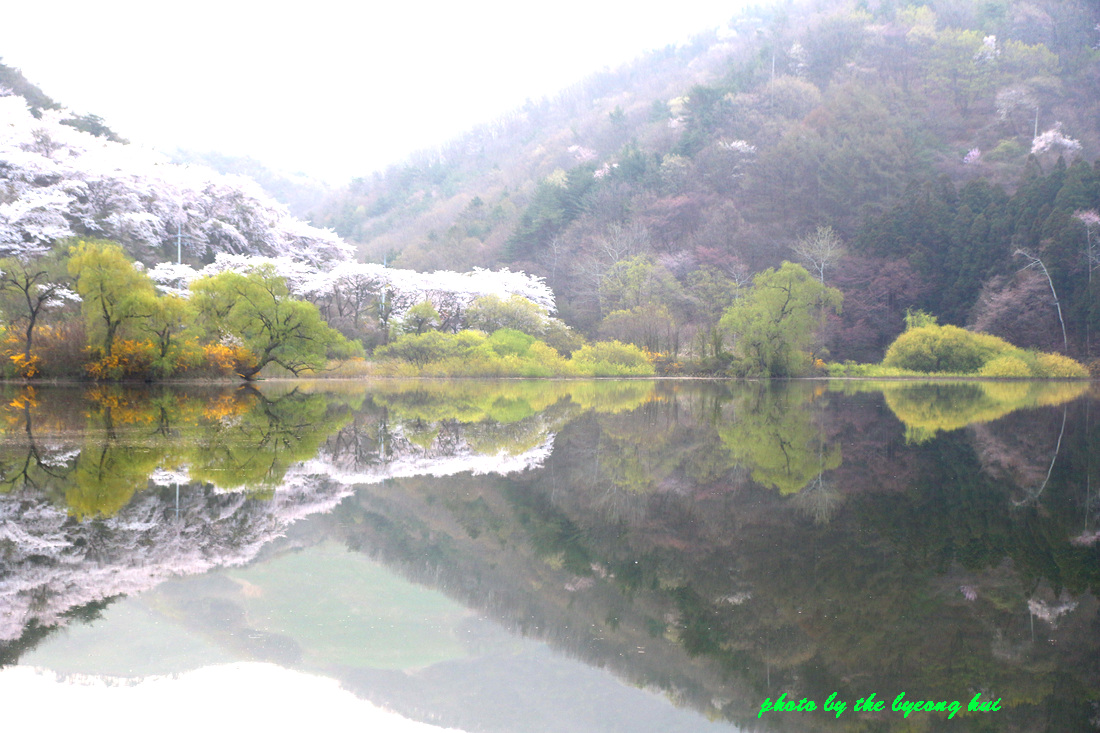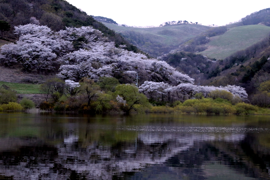 벚꽃이 비추인 아름다운 용비지 환상입니다