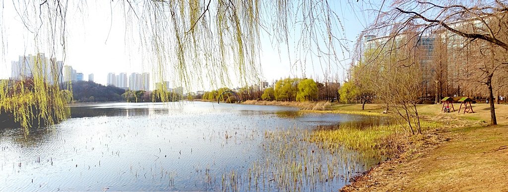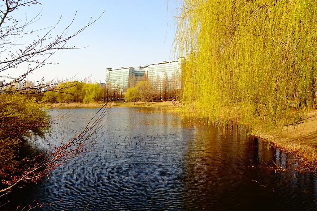 파란 호수 물가 옆으로 초록빛깔의 능수버들 참 보기 좋지요