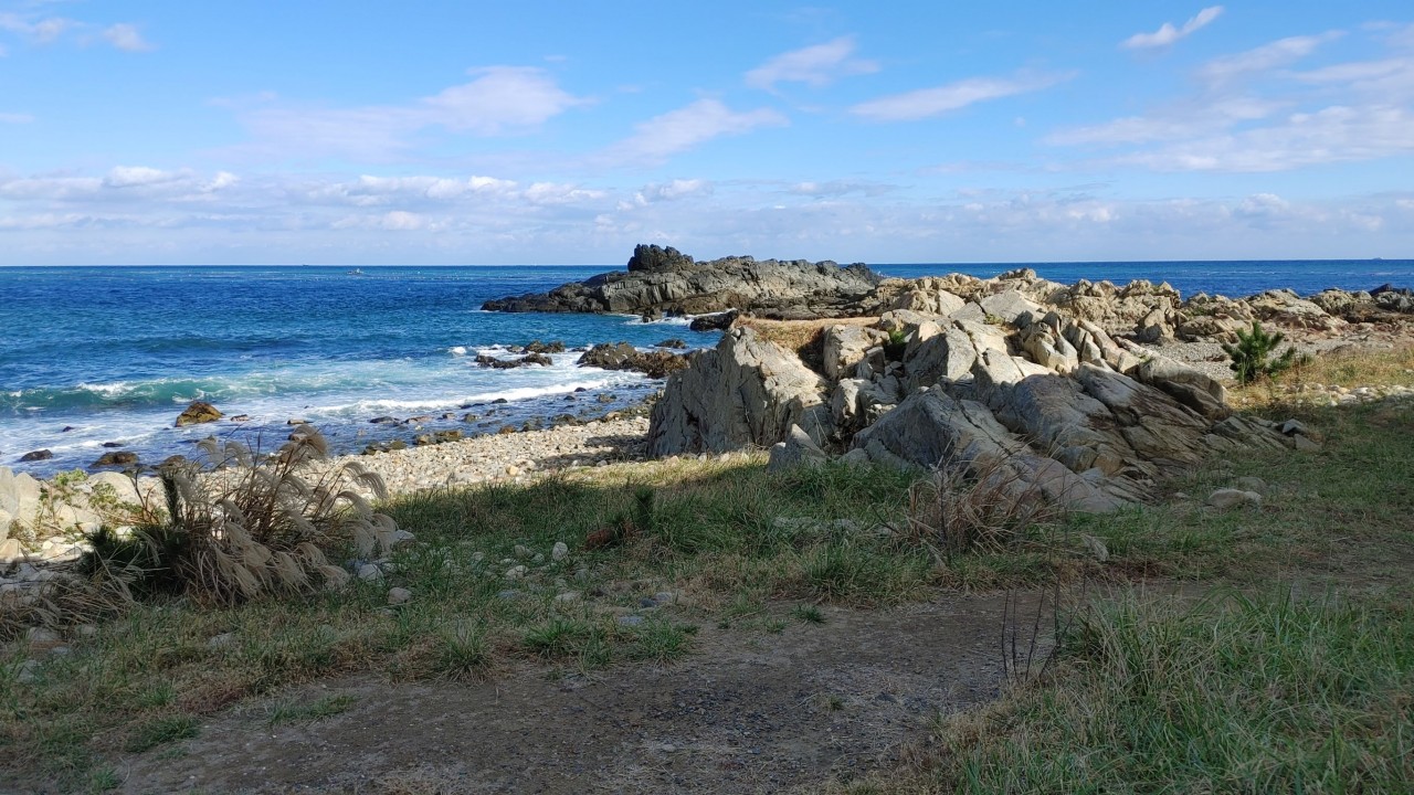 푸른 바다와 하얀 구름의 모습이 멋진 바닷가 모습입니다.