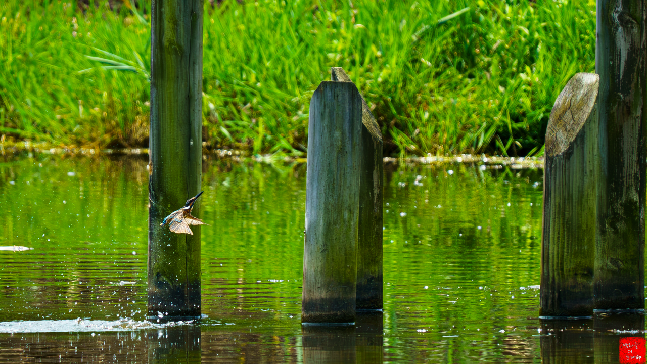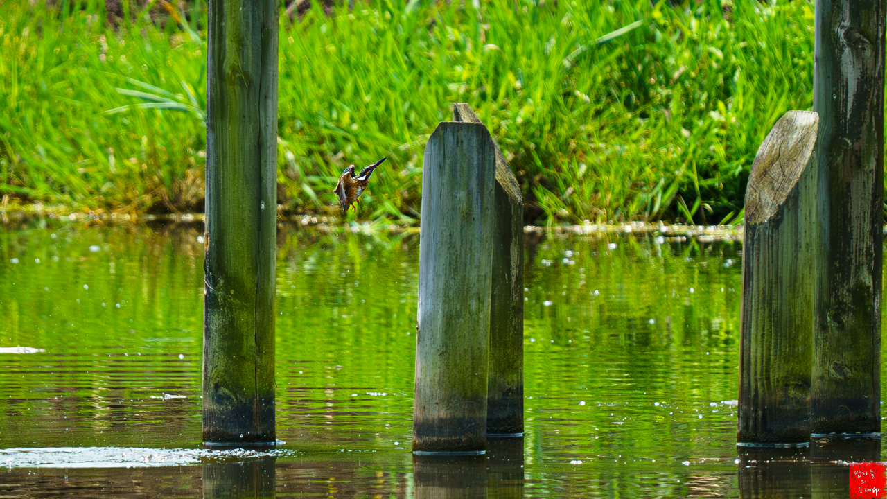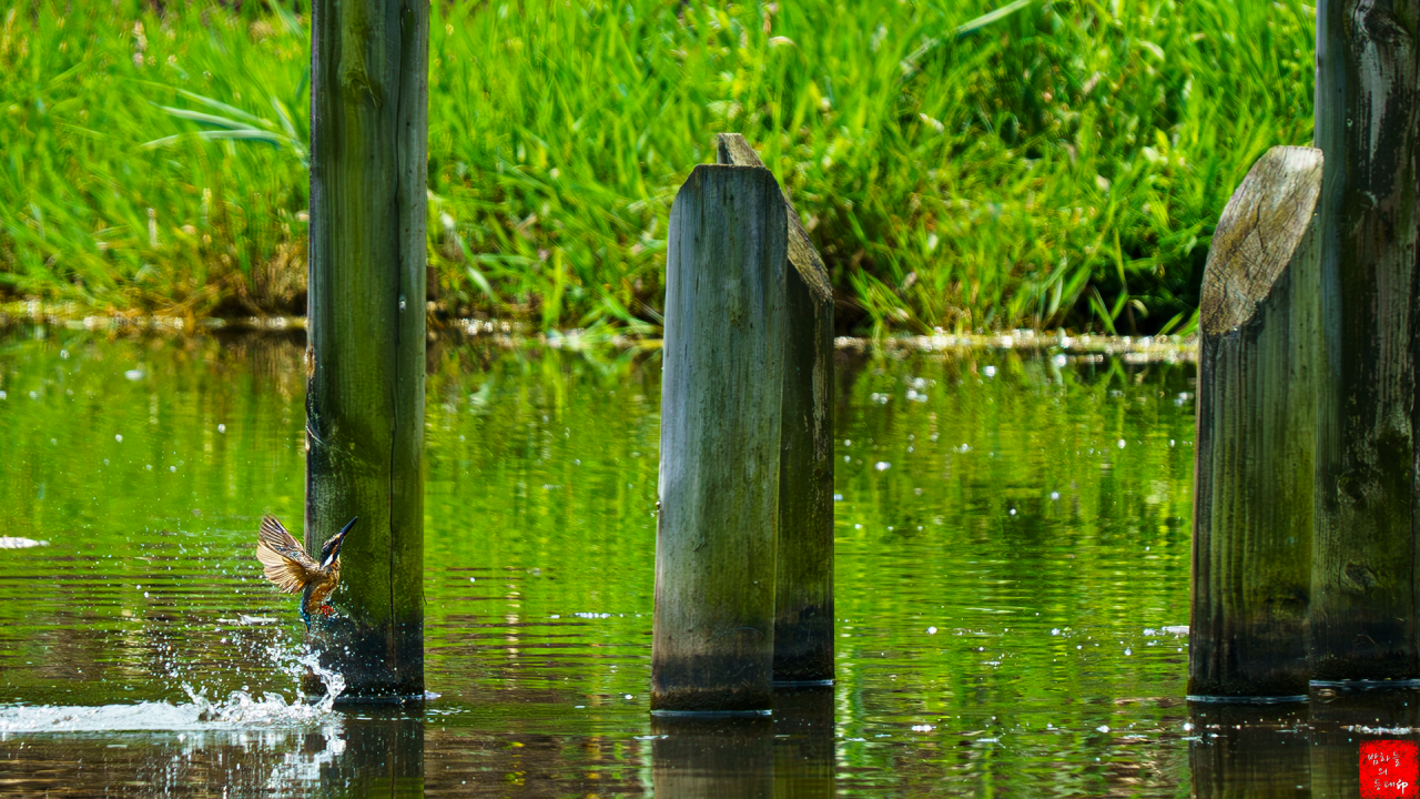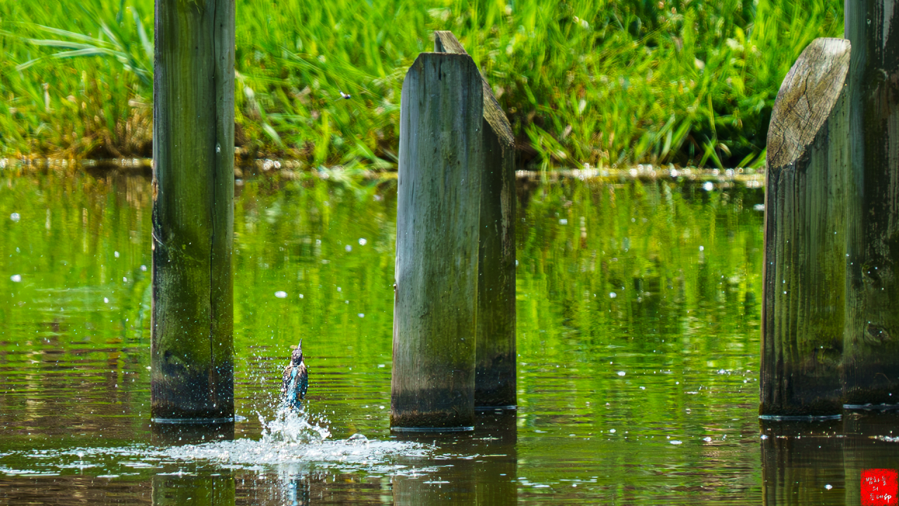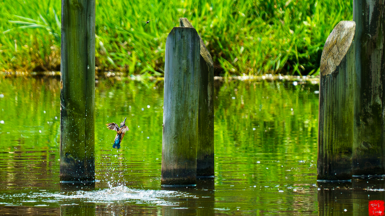 수목원 저수지에서 자연스럽게 만난 물총새의 다이빙샷이라