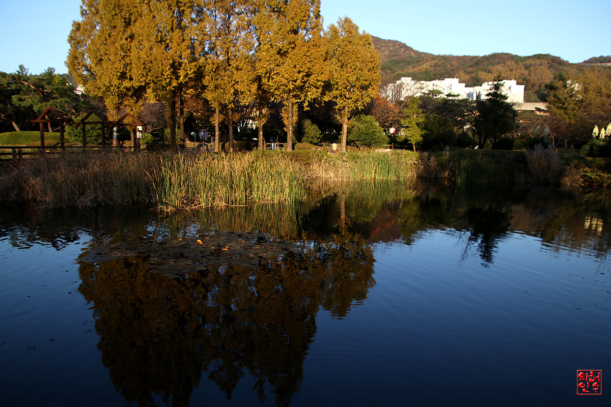 메타세쿼이아도 보이고, 호수 속의 반영도 보이지만