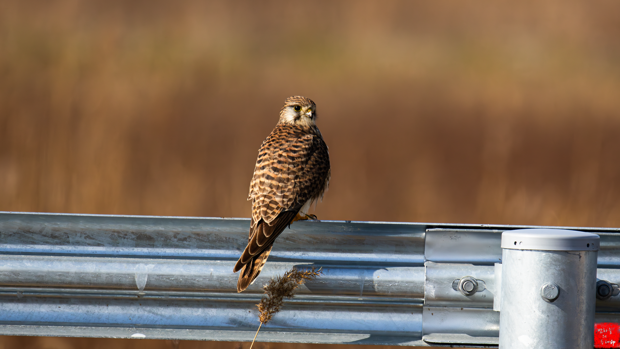 먹이를 잡고 도로의 시설 위에 앉아서 먹고 난 후의 모습입니다.