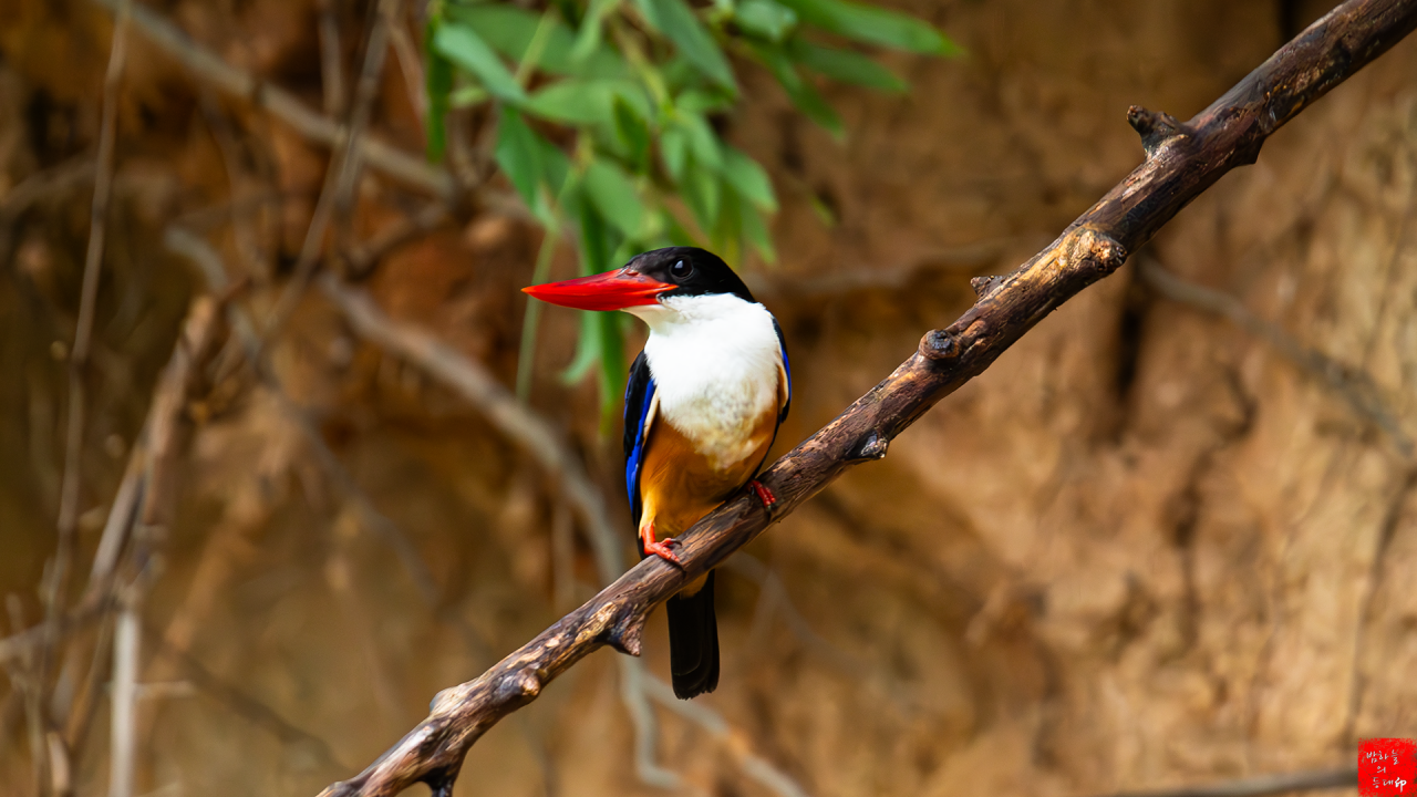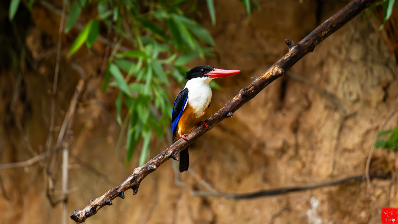 절개지의 흙벽의 둥지 앞에 놓인 횟대에 청호반새의 모습이 보이니