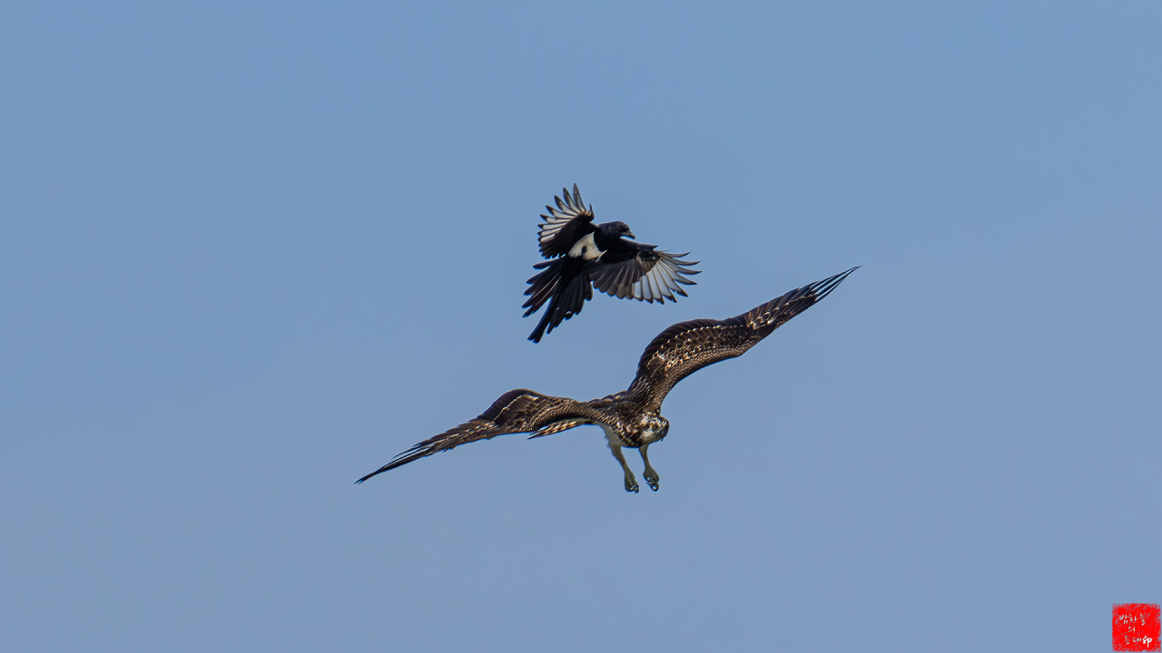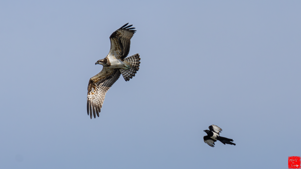 까치가 몰려있는 영역에 물수리가 들어오면 까치들이 텃세를 부립니다.