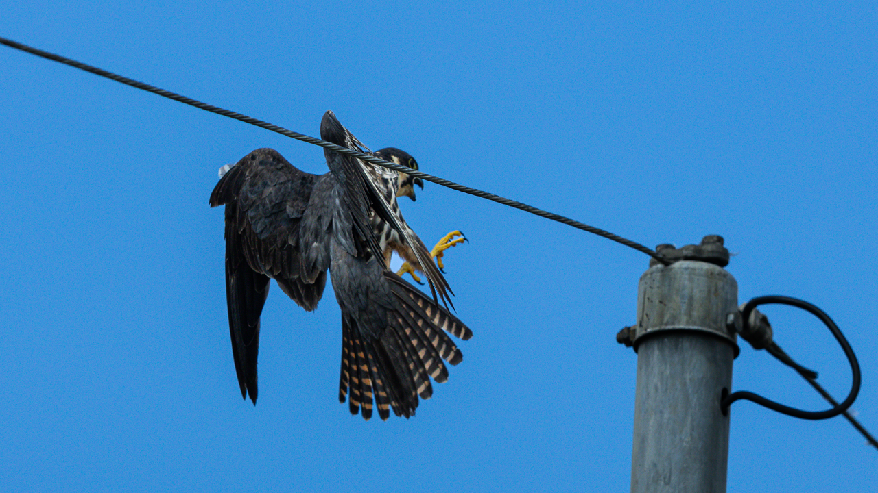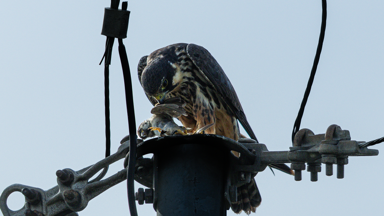김포 고촌에서 육추 중인 새호리기 성조가 작은 새를 사냥한 모습과