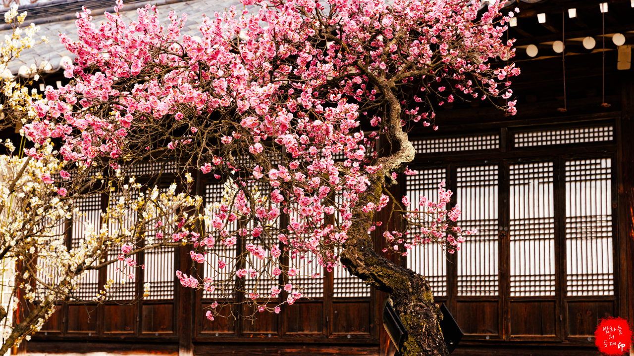 이순신 장군이 사시던 고택의 창살과 고택을 배경으로 홍매화를 담는 구도를