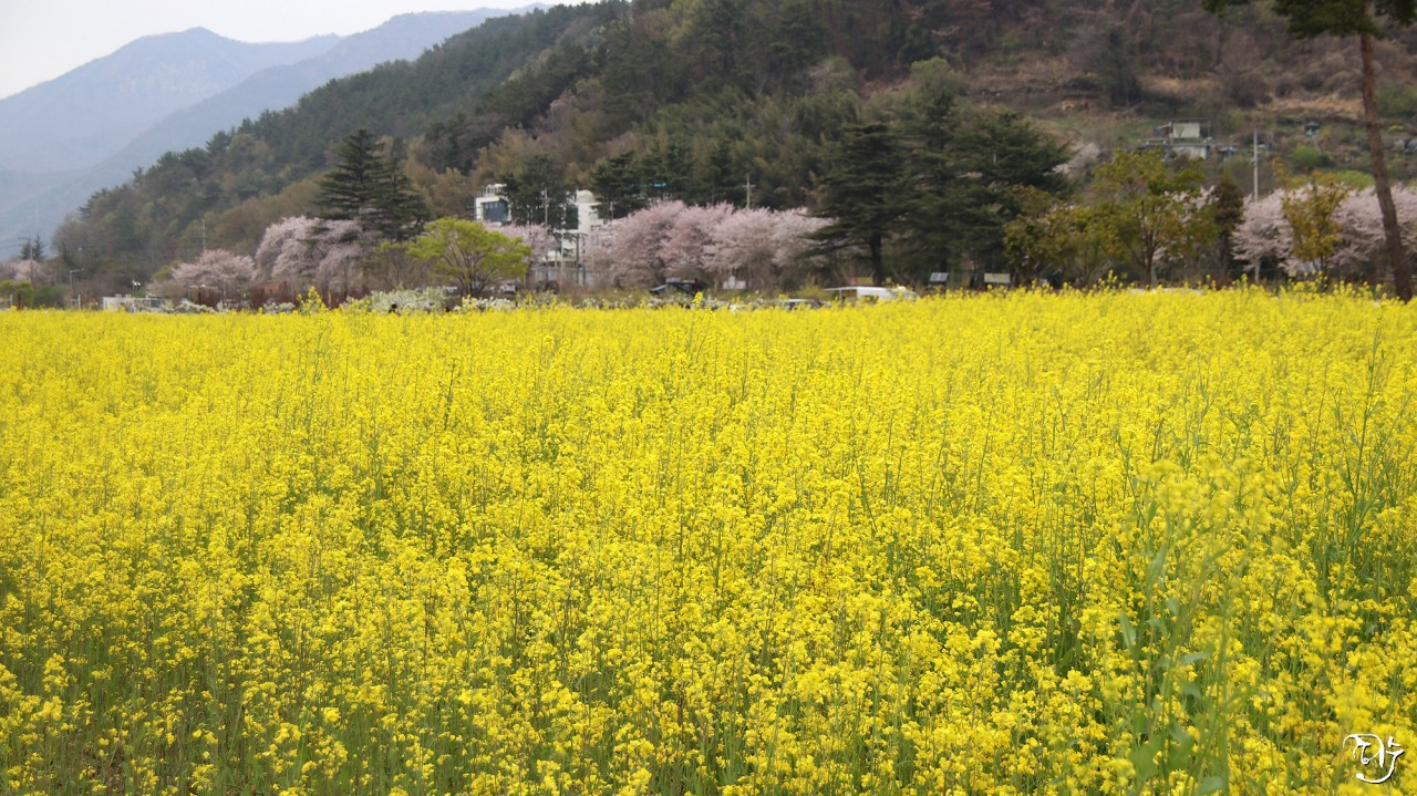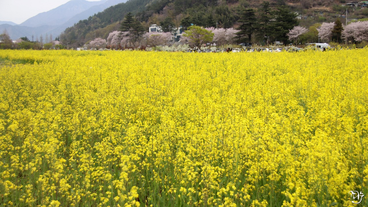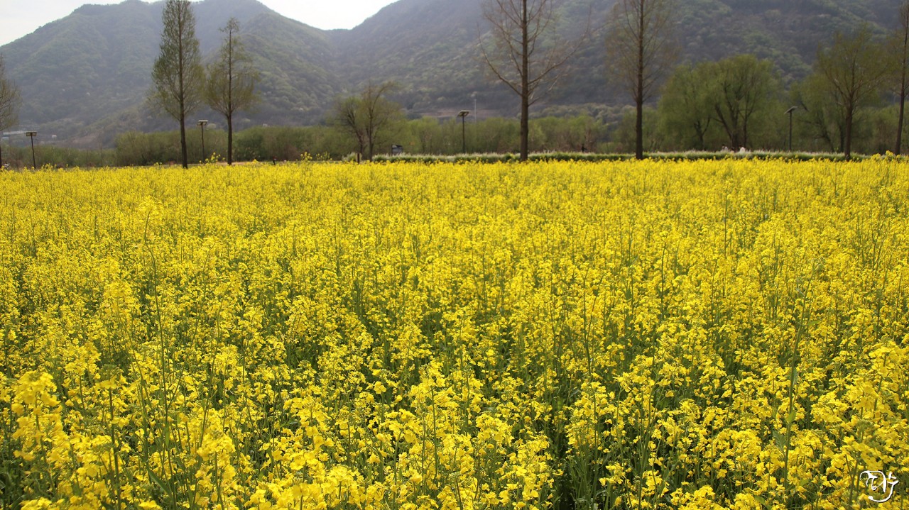 노란 유채꽃밭이 수채화를 보는 느낌이군요.