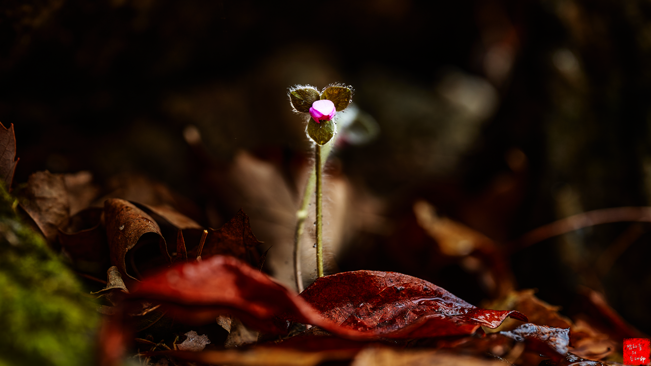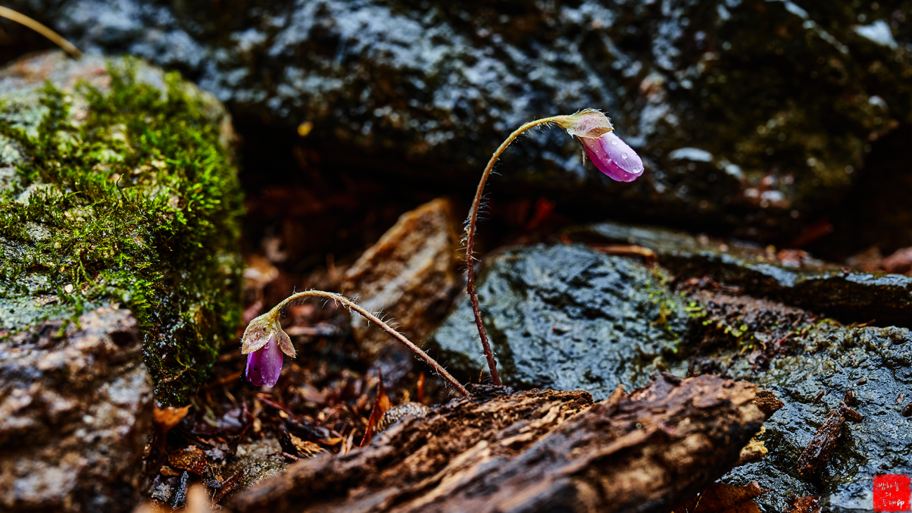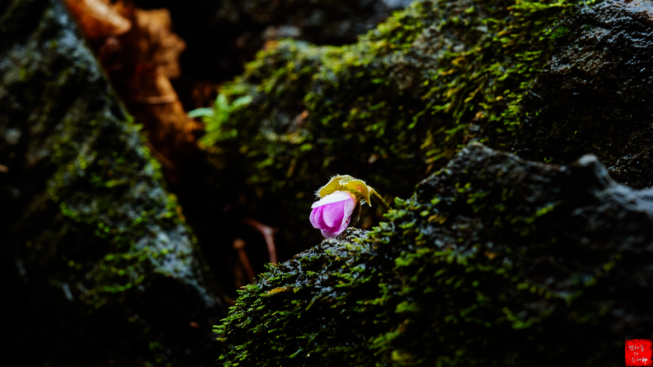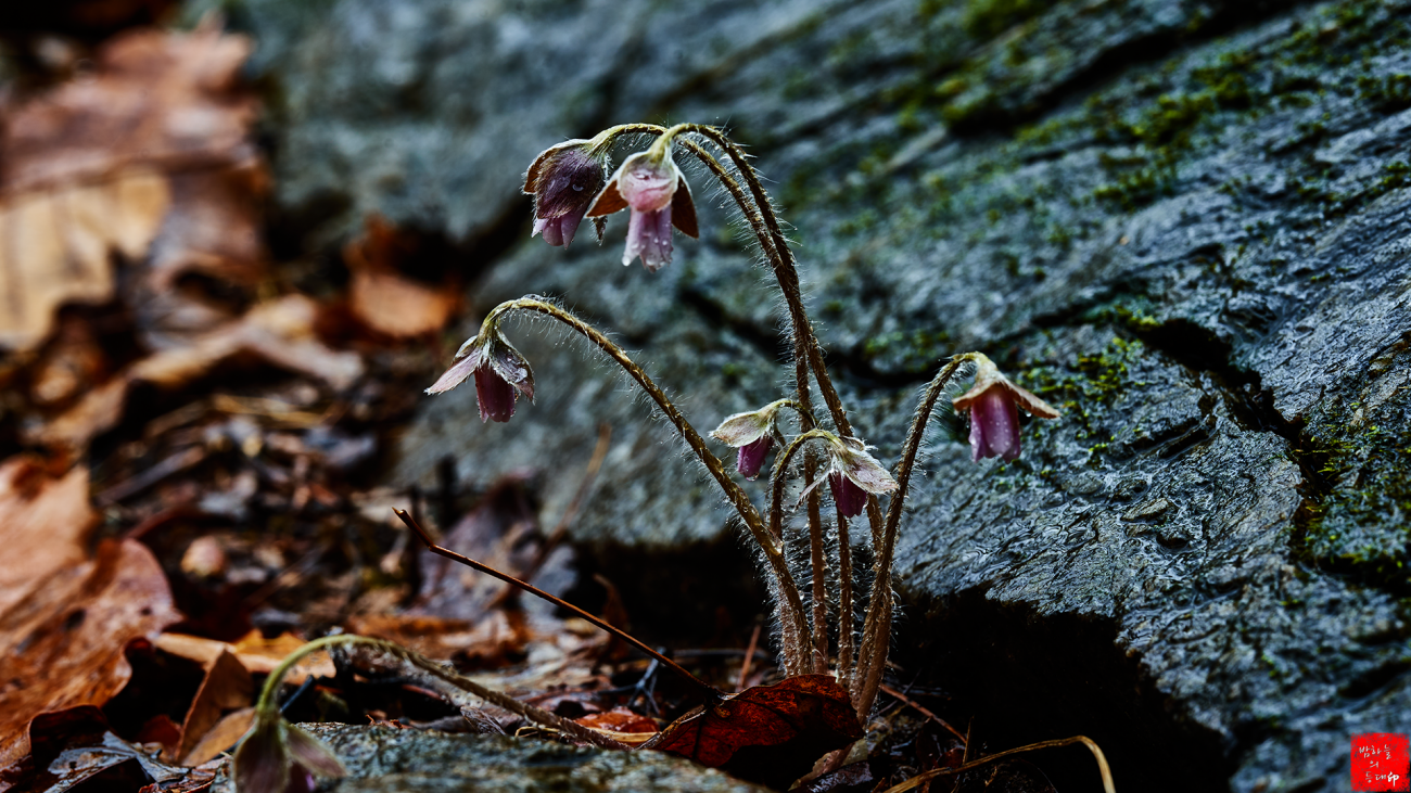 계곡 바위틈에 자생하는 노루귀와 배경이 괜찮은 편이라 생각을 해보는데