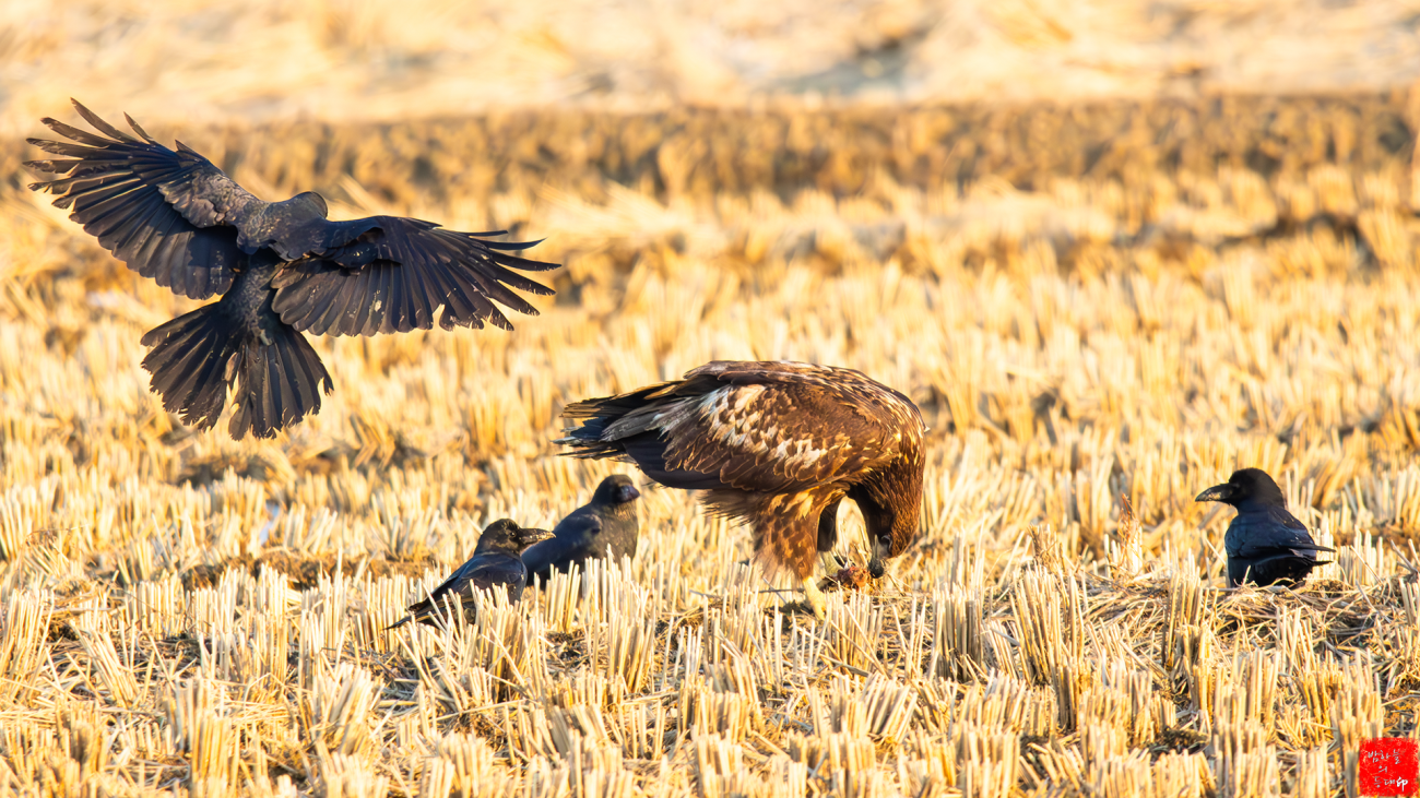 까마귀 가운데에 흰꼬리수리가 무엇인가를 사냥한 모습을 발견하였다.