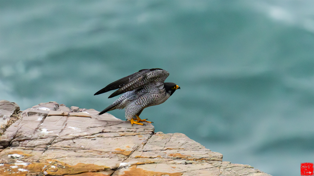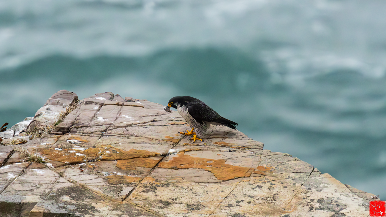 시속 300km 이상의 빠른 속도로 나는 송골매를 바다를 배경으로 하는 보케와 함께 담는