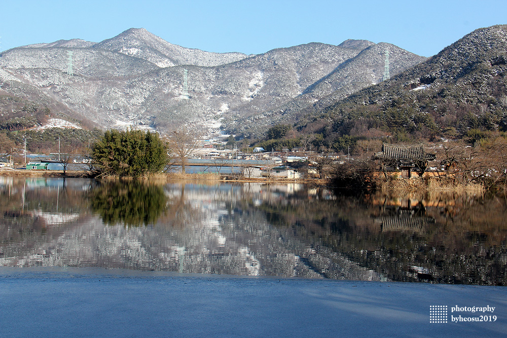 눈이 내려있는 뒷산도 포근하고 물 위에 사는 수초가 없는 부분의 반영도 깔끔합니다