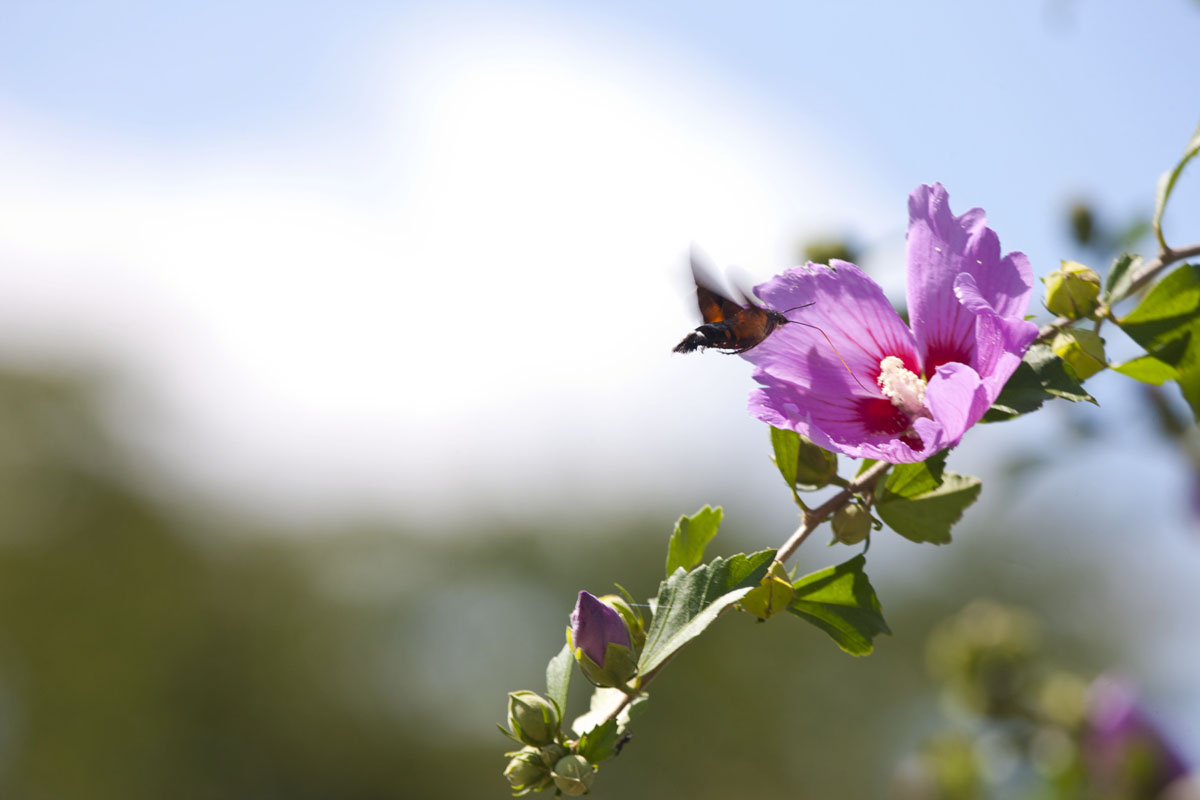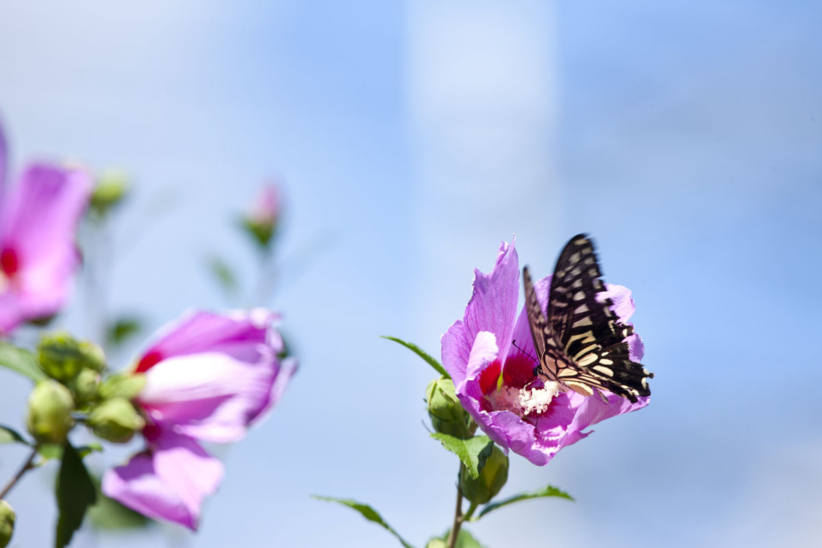 한그루 무궁화. 활짝핀 꽃몽우리에 호랑나비.박각시들 경쟁하듯이