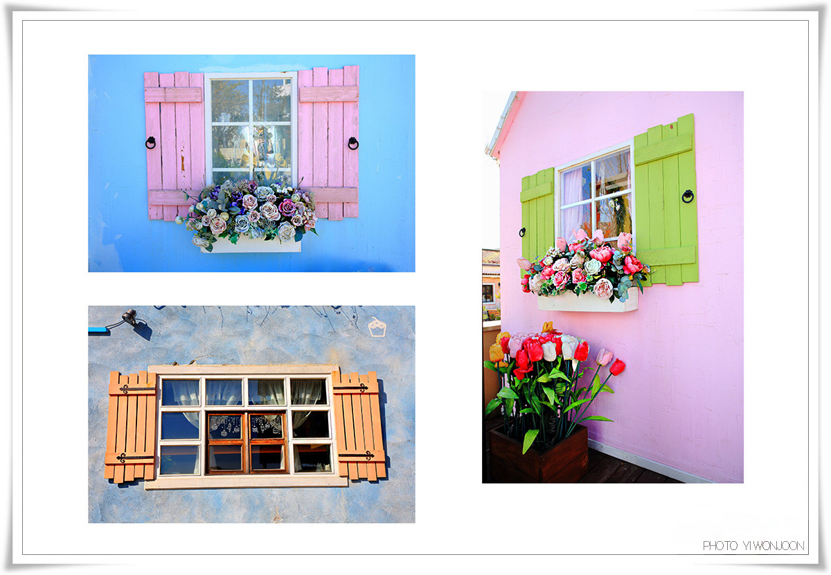 화분이 놓여 있는 고운 색갈의 창문들이 예쁘게 나 있으며