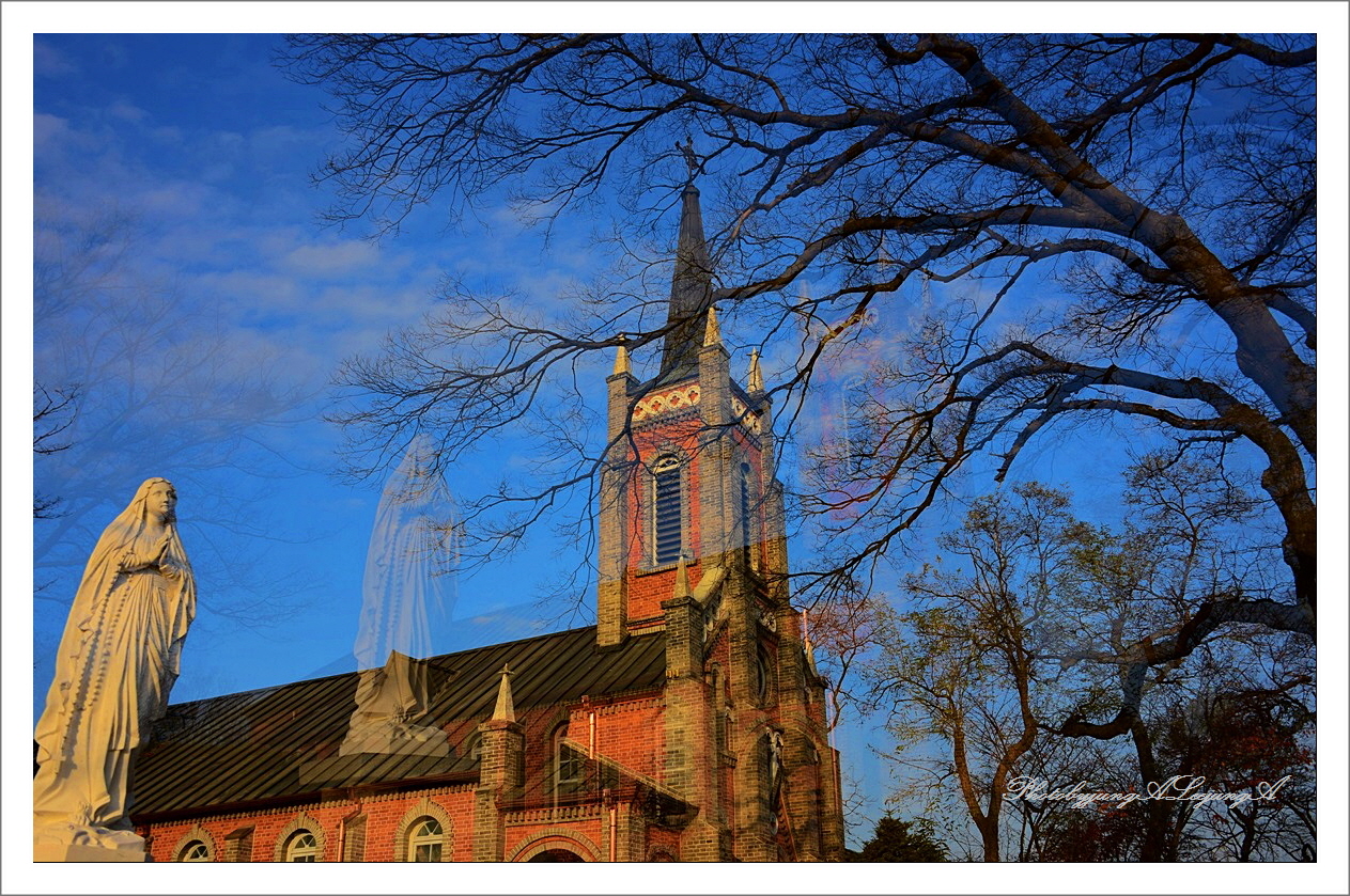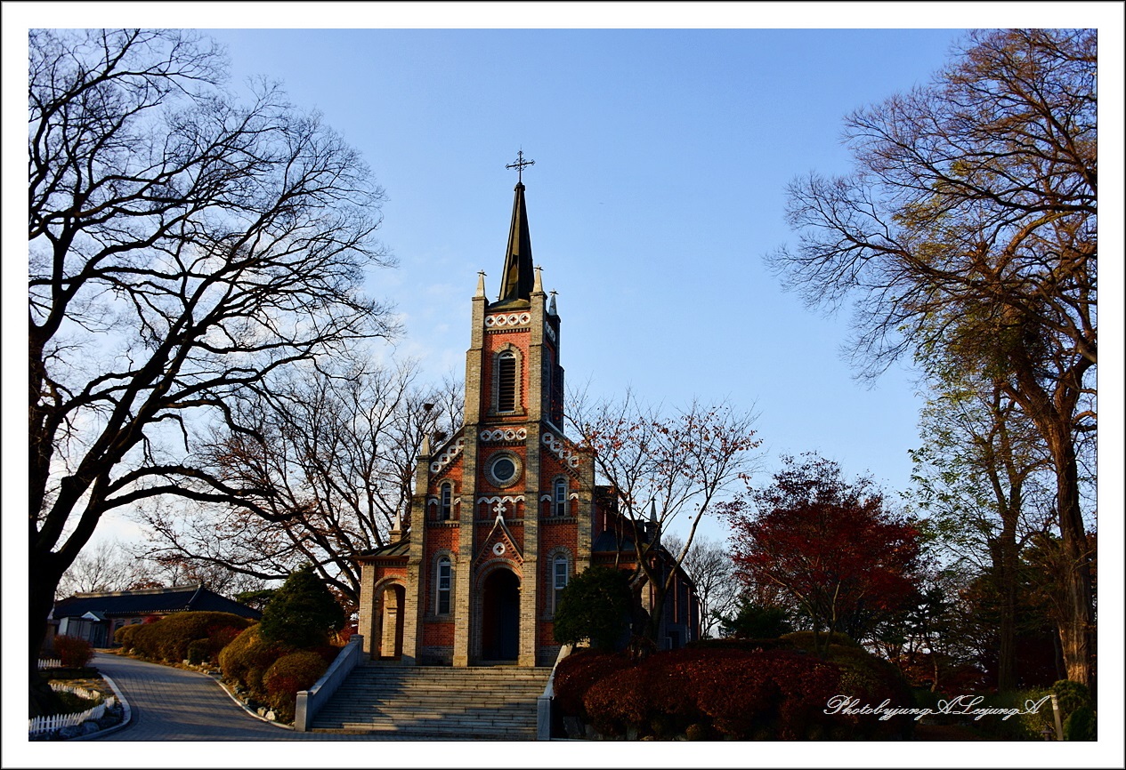 나무잎 무성할때는 잎에 가리어 잘 보이지 않는 성당건물