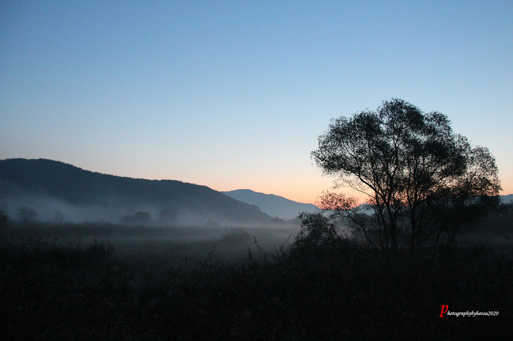 아직 여명이 밝아오려면 시간이 좀 걸릴 것 같아 캄캄하고 안개자욱한 화포천 풍경을