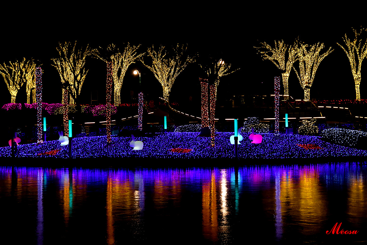 순간 한꺼번에 불빛조명이 켜지며 풍차며 연못 주위의 온갖 색깔 불빛들이 봄꽃처럼 환한게 웃고 있었다.
